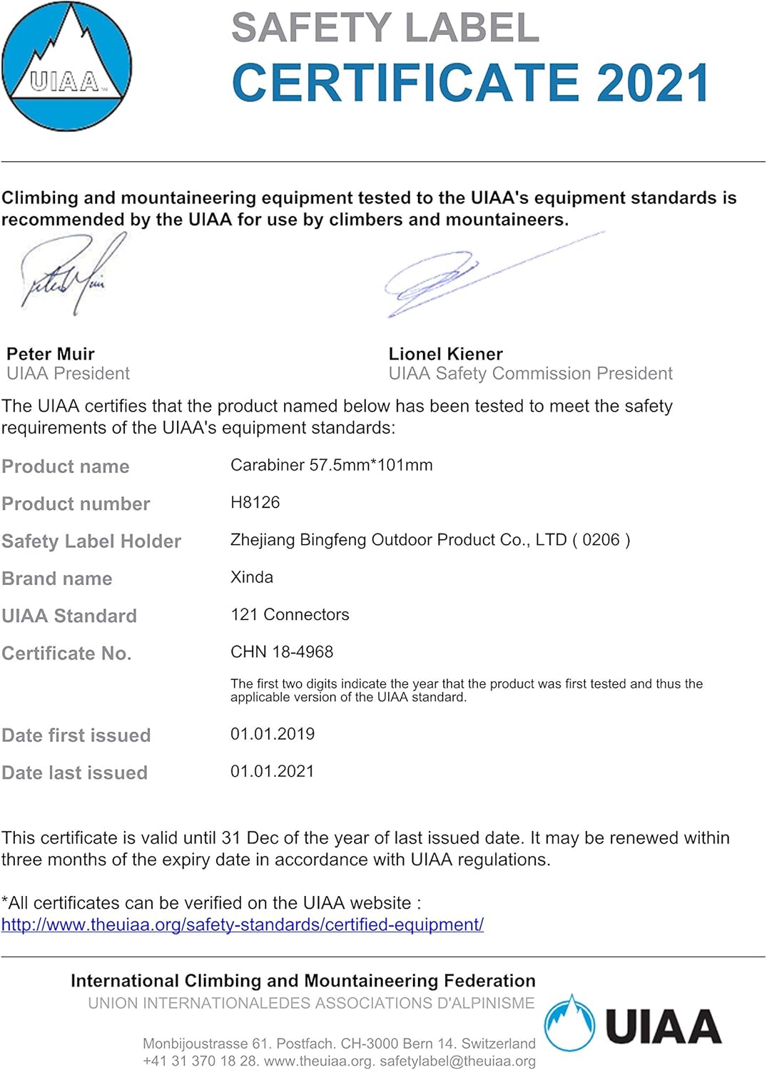 Xinda climbing carabiners are UIAA certified with certificate No. CHN 18-4968. You can check it on UIAA webiste