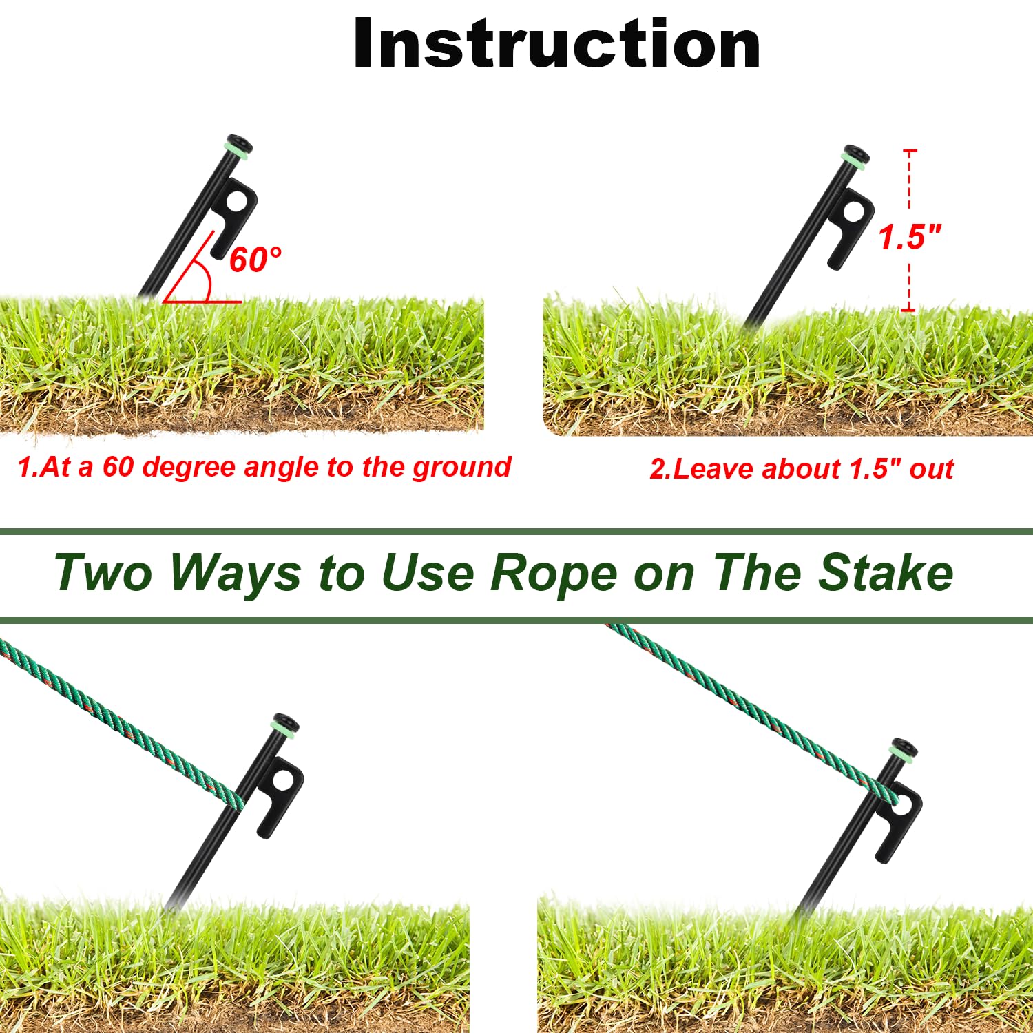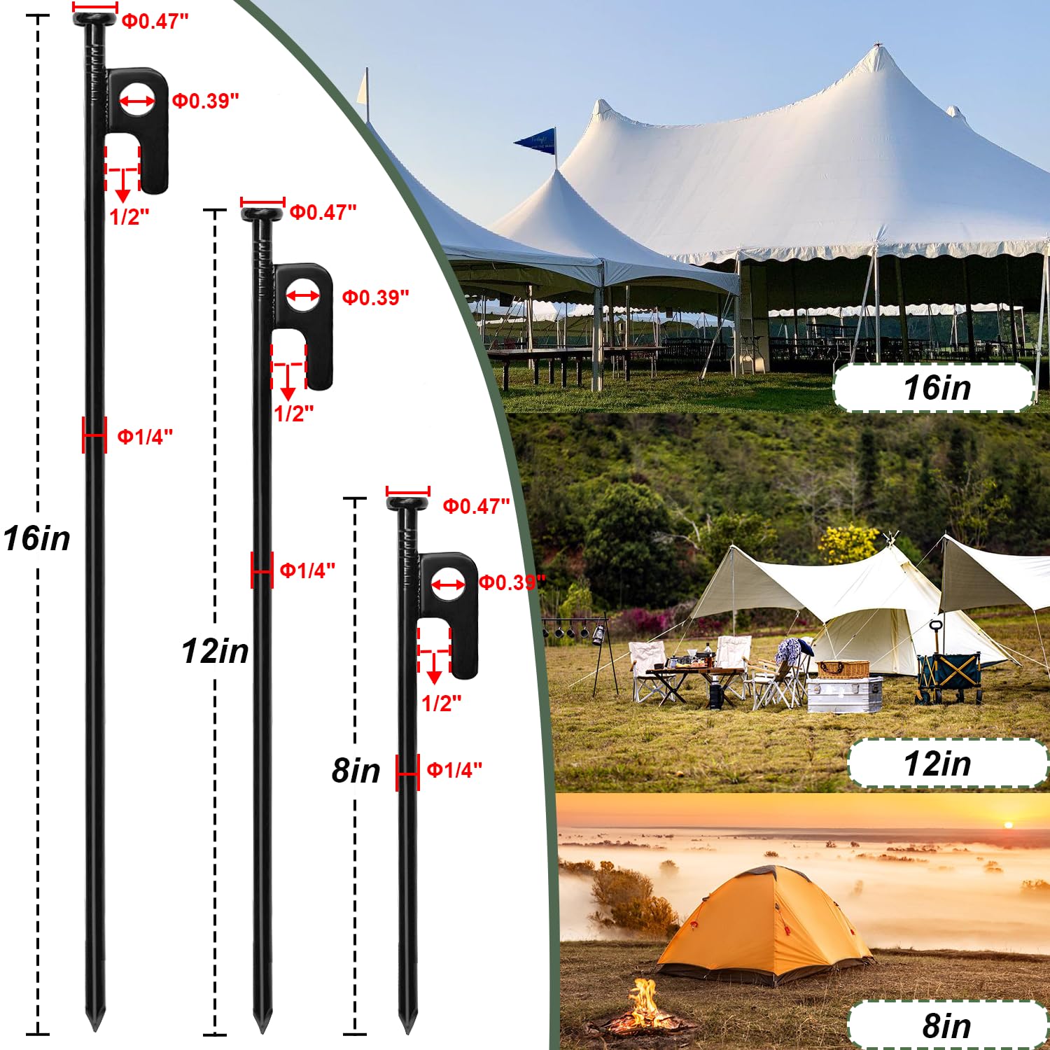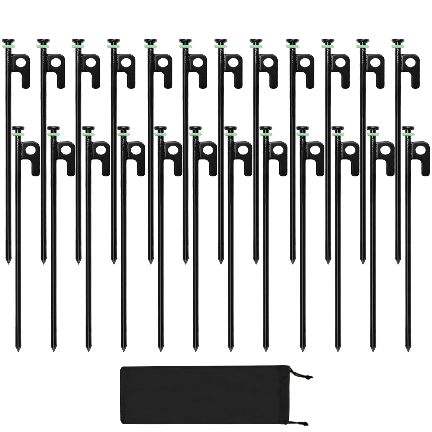 - 【Value Tent Stake Kit】Package come with 24pcs of 12in metal tent stakes(Diameter 1/4", weight 2.7oz), 24pcs fluorescent rubber rings, 1pc storage pouch.