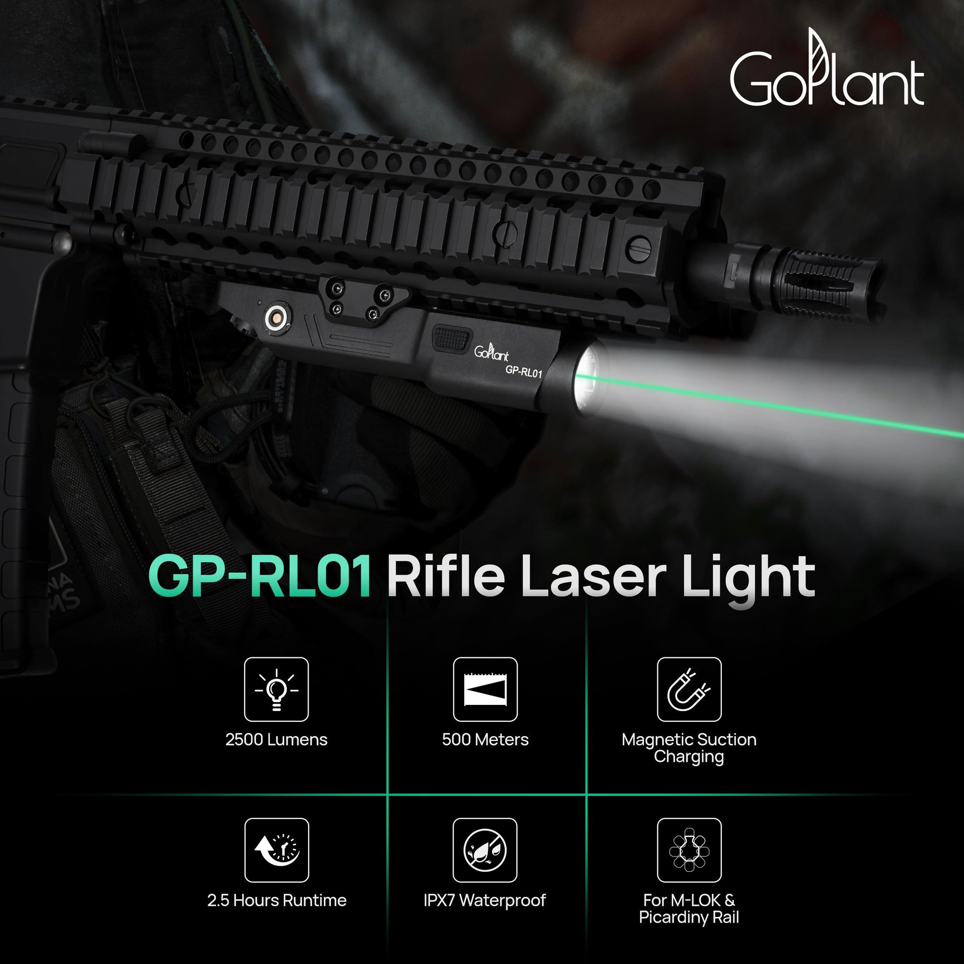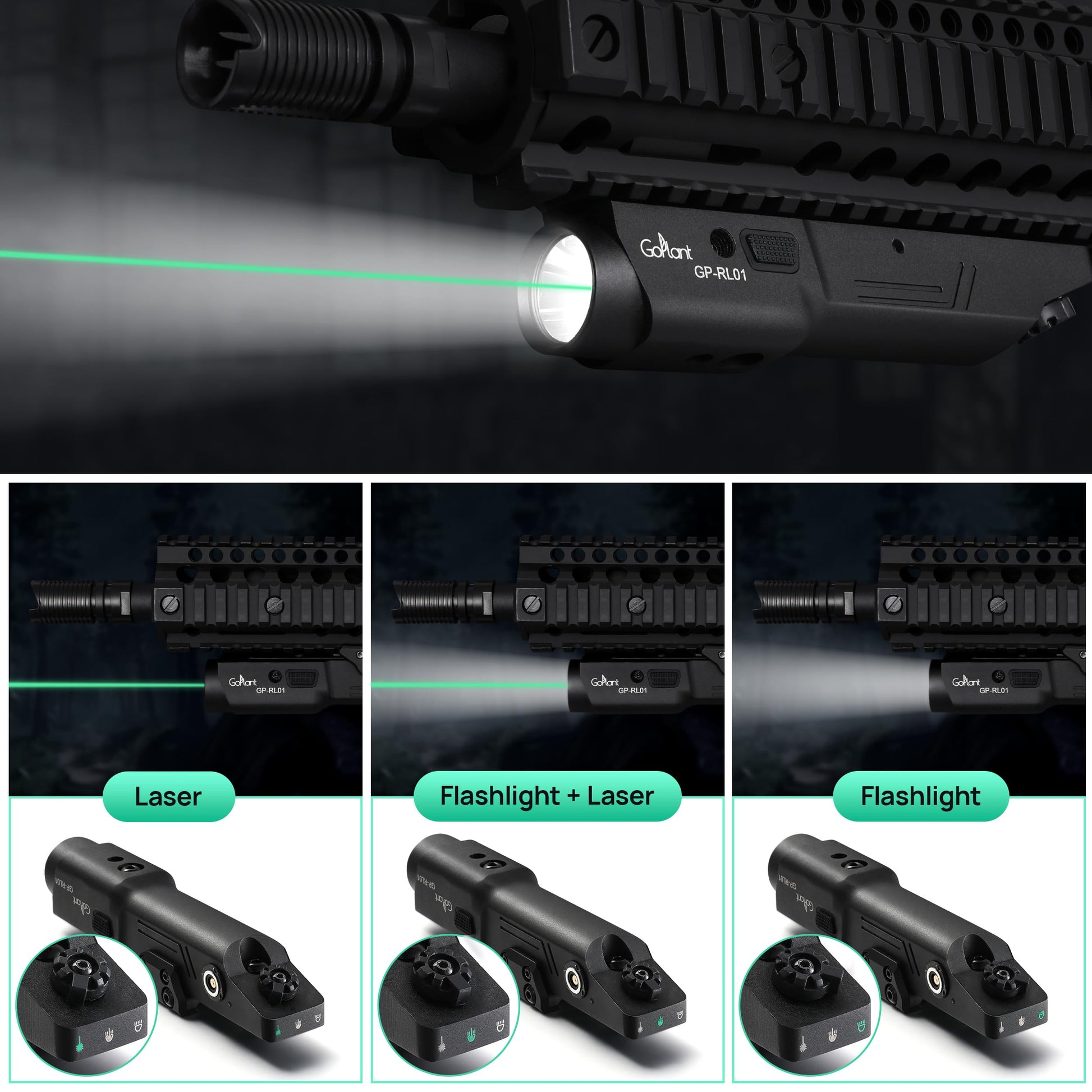 - 【THREE LIGHT COMBO MODES】 GOPLANT 2500 lumen GP-RL01 picatinny & M-lock rail flashlight with 3 selectable settings: laser only, flashlight+laser combo,flashlight only. You can precisely aim your target easily day or night. Class IIIA laser, less than 5mW for rifle.