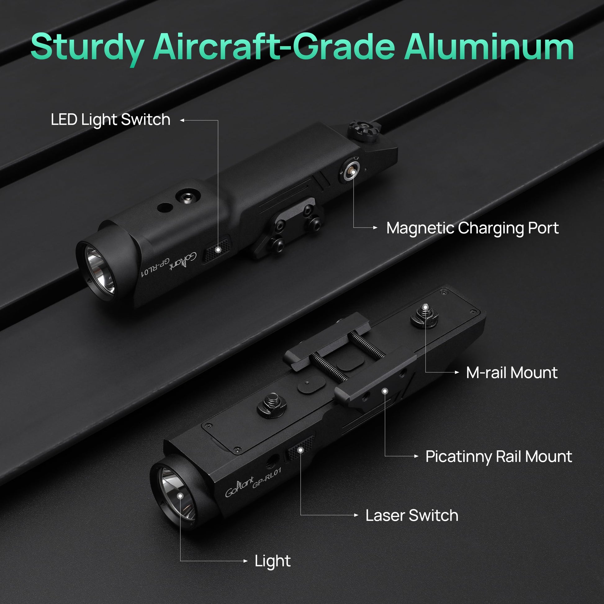 - 【LOW PROFILE RIFLE LIGHT WITH TWO RAILS】 Low Profile GP-RL01 is only 1.57 inch higher than the rail surface. Compatible Mlok and Picatinny rail mounts for versatile use.