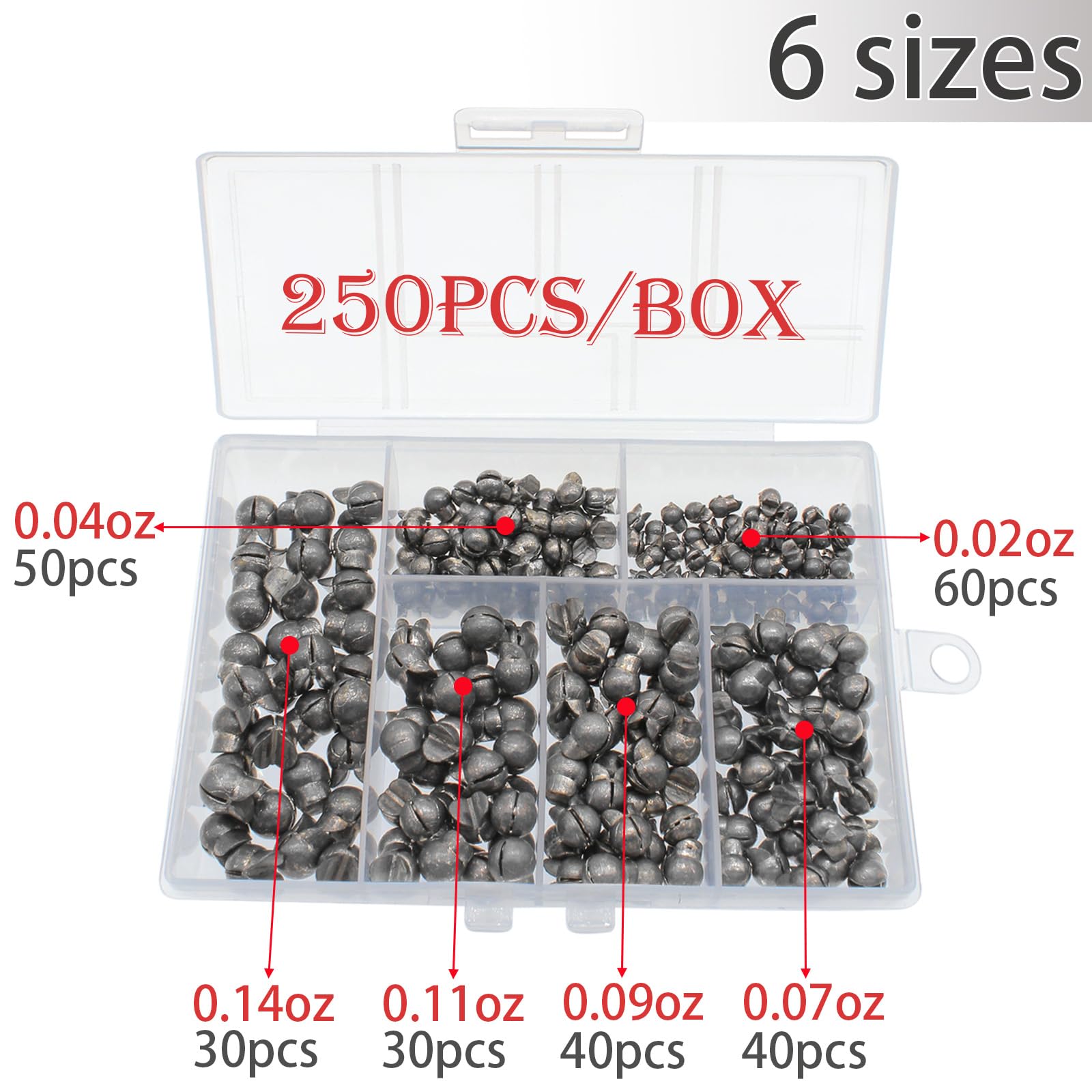 - 【Multi-size】Total 250pcs, 0.02oz 60pcs, 0.04oz 50pcs, 0.07oz 40pcs, 0.09oz 40pcs, 0.11oz 30pcs, 0.14oz 30pcs in a fishing tackle box, give you more choices.