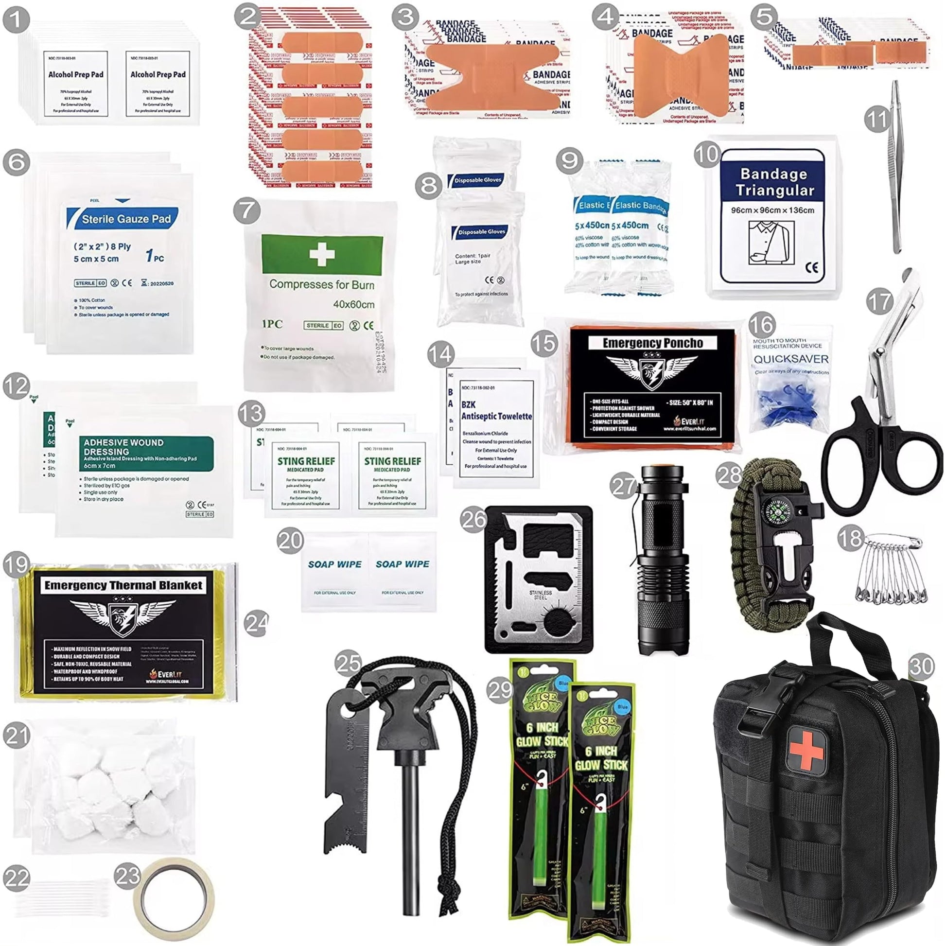 Survival Gear: 1 x Tactical EMT Molle Bag 2 x Glow Stick (12 hours) 1 x Tactical Flashlight (Battery Not Included) 1 x 5 Function Paracord Survival Wristband 1 x 11 Function Credit Card Multi-Tool 1 x Camping Knife 1 x Fire Starter (Ferro Rod & Steel Striker) 1 x Emergency Poncho 1 x Emergency Mylar Blanket