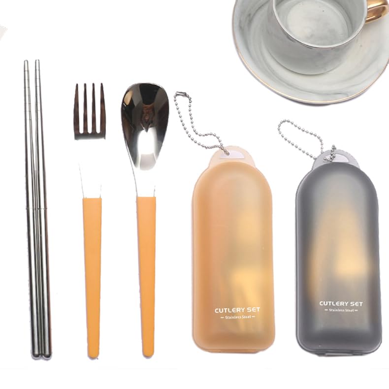 2-PCS Stainless Steel Foldable Cutlery Set with Case (Black+Orange).