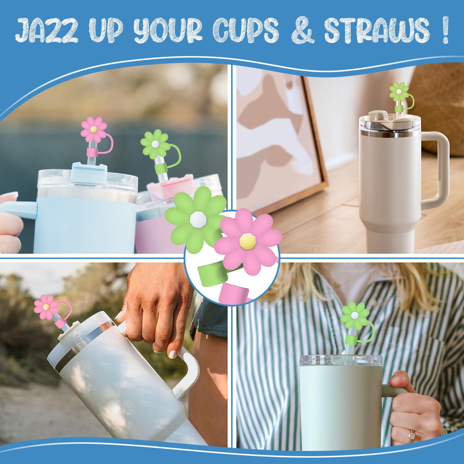 2PCS Cute Straw Covers Compatible with Stanley 30 & 40 oz Tumbler – 15mm Straw Cap with Stainless Steel Straw and Brush, Kawaii Accessories for Cup(Pink and Green)
