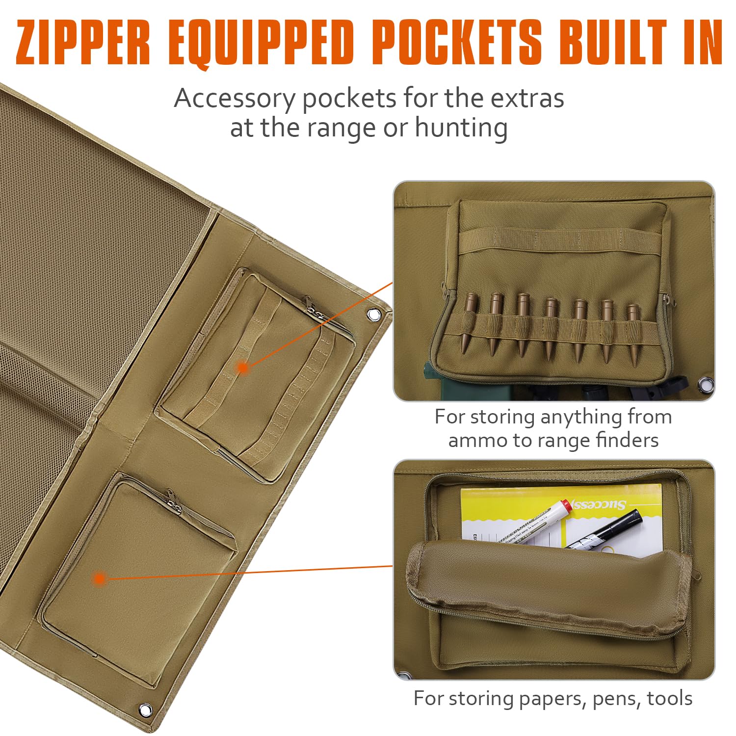 - 【2 Storage Bags】 - There are two accessory pockets on the mat. These pockets provide ample storage space for ammunition, cleaning supplies, and other shooting accessories, helping to keep everything organized and within easy reach. The storage bag on the left also has 15 special slots for bullet storage and 5 large buckles which can be used to place notebooks, etc