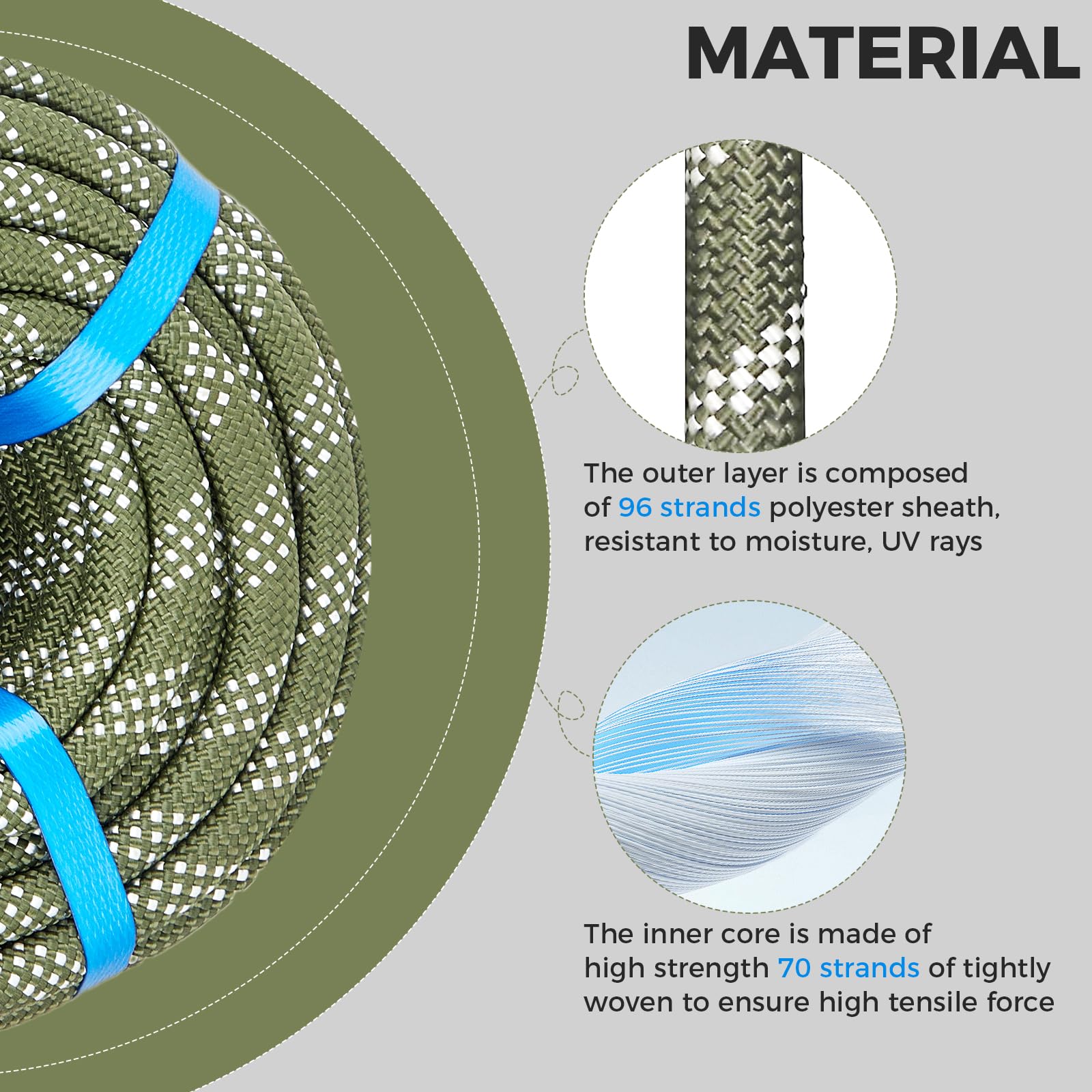 - High Strength: This arborist rigging Rope is composed of 96 strands polyester sheath and high strength 70 strands of tightly woven nylon inner core, resistant to moisture, UV rays, chemicals, and aging, this climbing rope maintains its integrity over time.