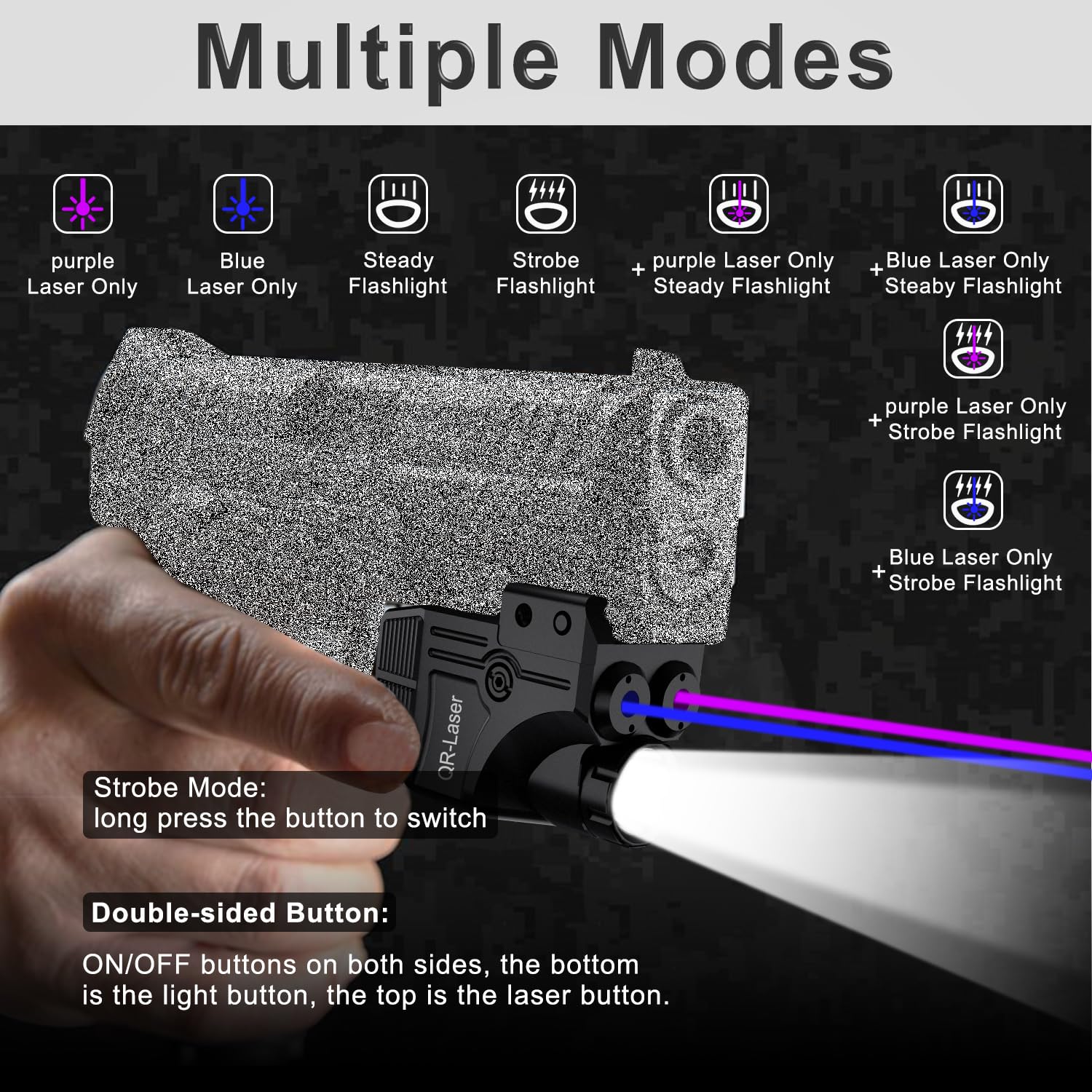 - MULTIPLE TACTICAL MODES TO CHOOSE - 3 in 1 purple Blue laser flashlight combo has multiple 8 sighting modes : purple LASER ONLY/ Blue LASER ONLY/ purple LASER LIGHT/ Blue LASER LIGHT/ STEADY LIGHT/ STROBE LIGHT/purple LASER STROBE LIGHT/ Blue LASER STROBE LIGHT. Long press the light button to switch to strobe mode.