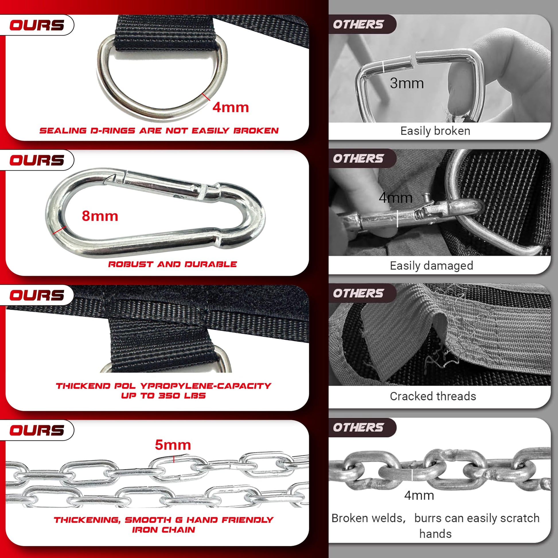- ⚙️The upgraded D-ring design provides better versatility and stability. These D-rings are located on both sides of the waistband to ensure even weight distribution and better stability during training.