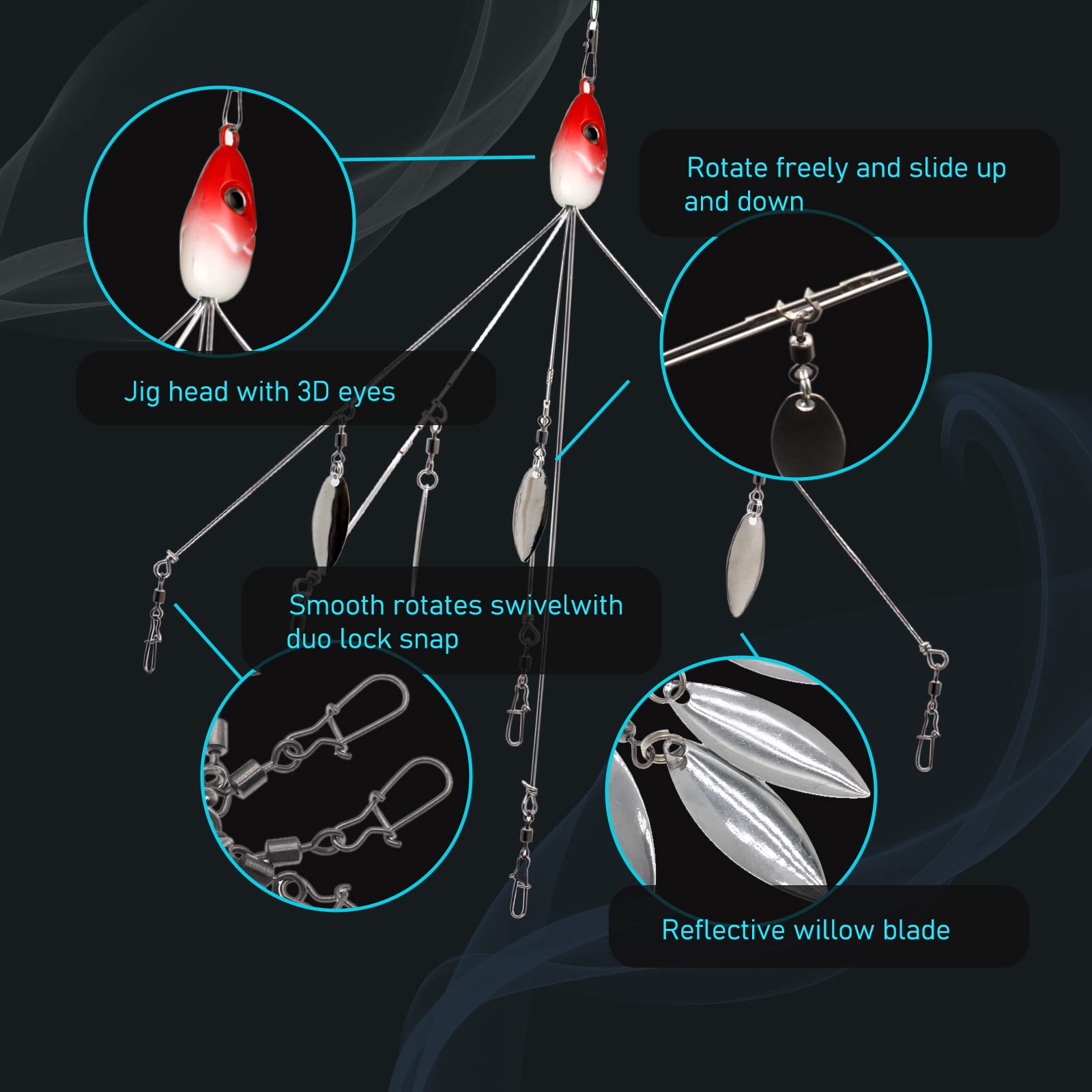- 【Suitable for Multiple Soft Baits】: 5 sturdy steel arms ensure strength and flexibility. Sinkerless product with blades. High-quality snaps and swivels allow for easy rigging with a variety of lures.