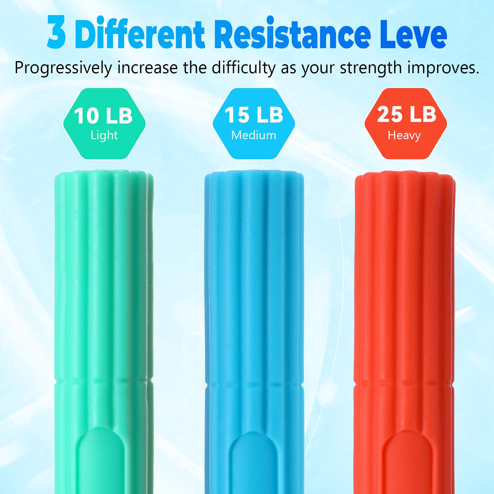 - 【3 Level Resistance & Arm Strength】- Boost your workouts with the twist hand exerciser bar set, which features 3 color-coded resistance levels ranging from 10 lbs to 25 lbs. Customize your workout with: Green (10 lbs, Light), Blue (15 lbs, Medium), and Orange (25 lbs, Heavy) to gradually increase strength. Great for physical therapy and arm muscle development, start at a level that's right for you and progress at your own pace.