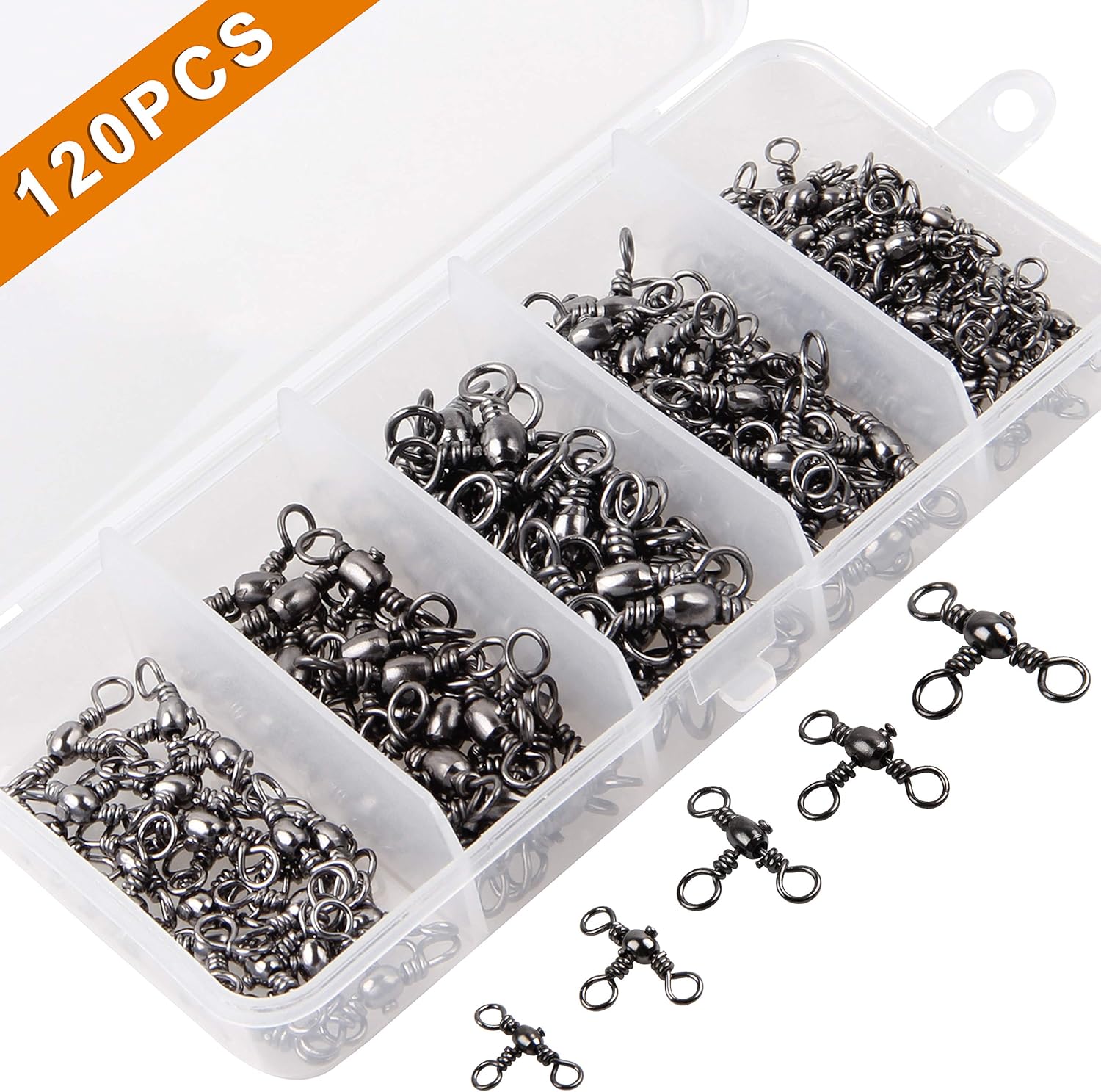 3 Way Swivels Fishing Kit 120pcs Heavy Duty Three Way Fishing Swivels Crossline Barrel Swivels Tackles T-Shape Fishing Line Connector Catfish Rig Triple Swivels for Saltwater Surf Fishing Rig