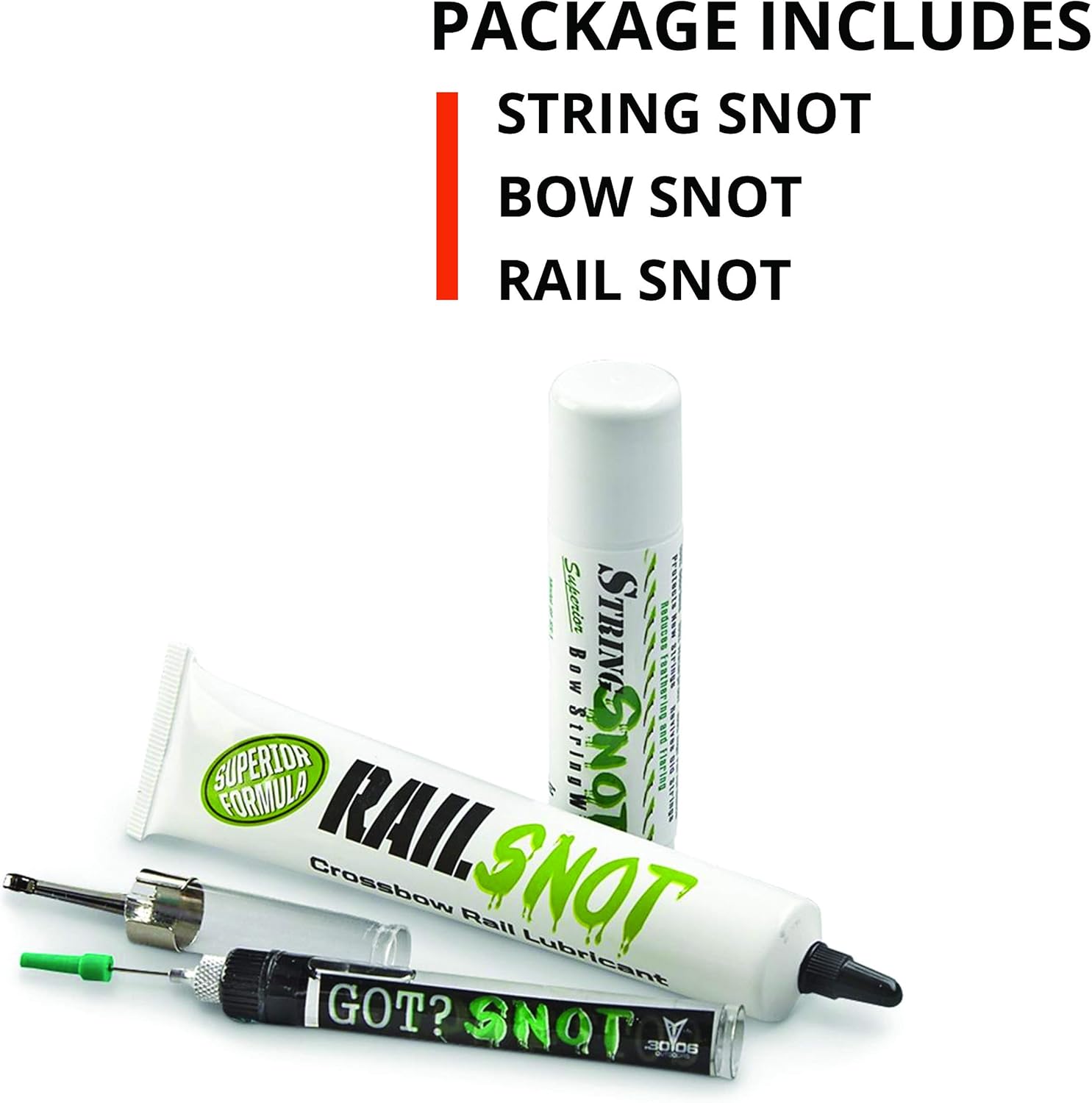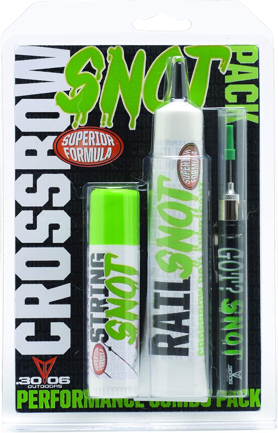 The .30-06 Outdoors Snot Lube combo three pack for crossbows includes one each string snot (string lubricant), bow snot (parts pen oiler) and rail snot (crossbow rail lube). This is a complete kit of high performance lubricants for your crossbow. Made in the USA.