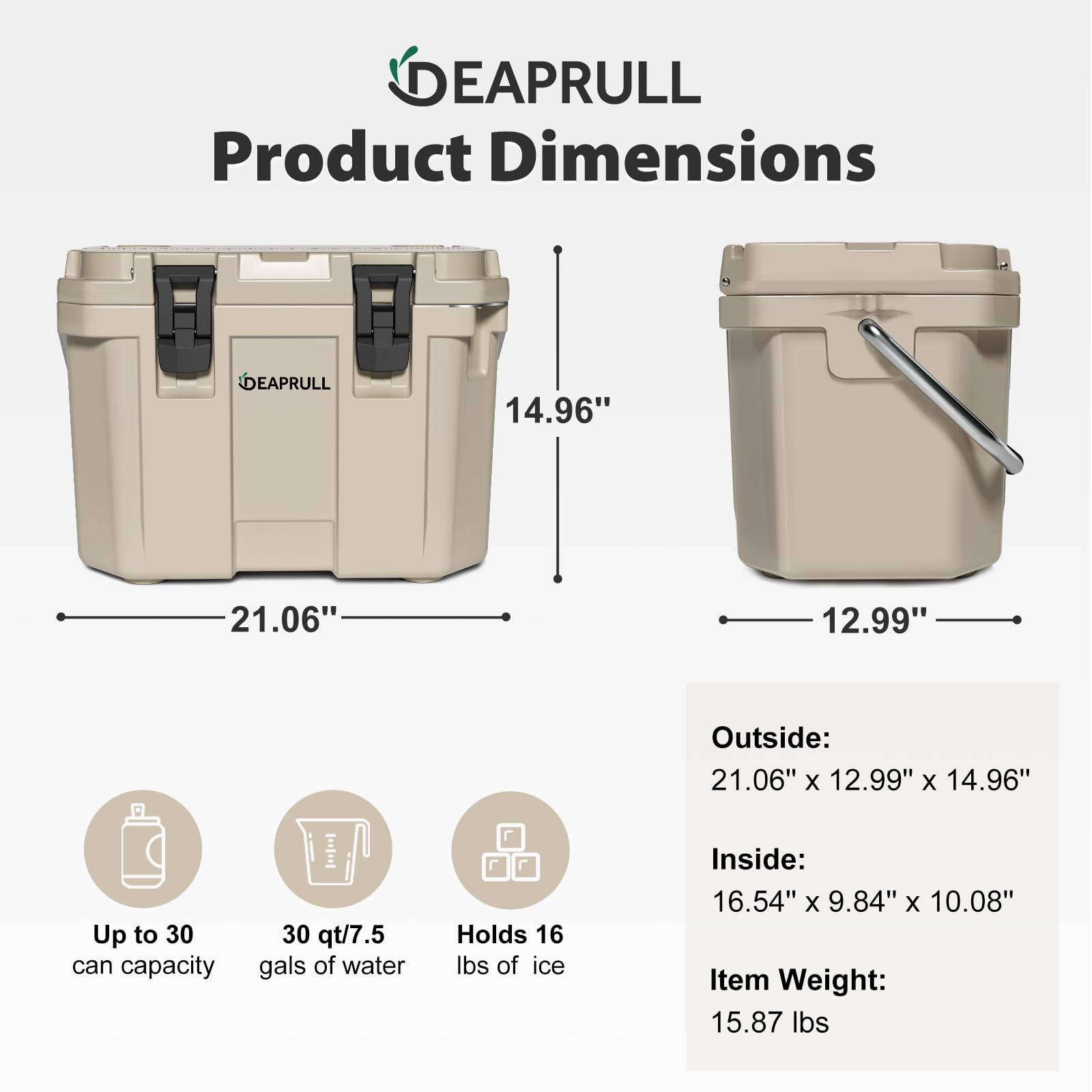 30 Quart Hard Cooler, Insulated Ice Chest Box Holds Ice for More Days, Portable Cooler with Handle, Cup Holders, Double Latches for Camping, Drink, Beverage, Beach, Picnic, Fishing, Boat, Barbecue