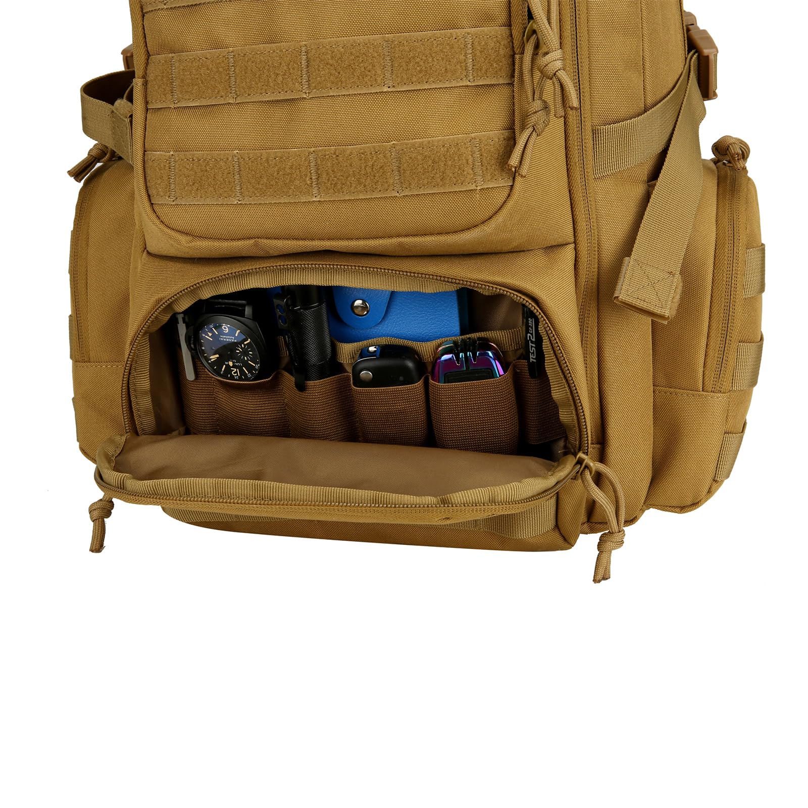 - Heavy Duty Backpack----This military backpack for men is made of high density 900D oxford fabric, stable and water resistant, double-stitched, heavy duty zippers and utility-style cord pulls, all for enhanced performance of the military assault pack.