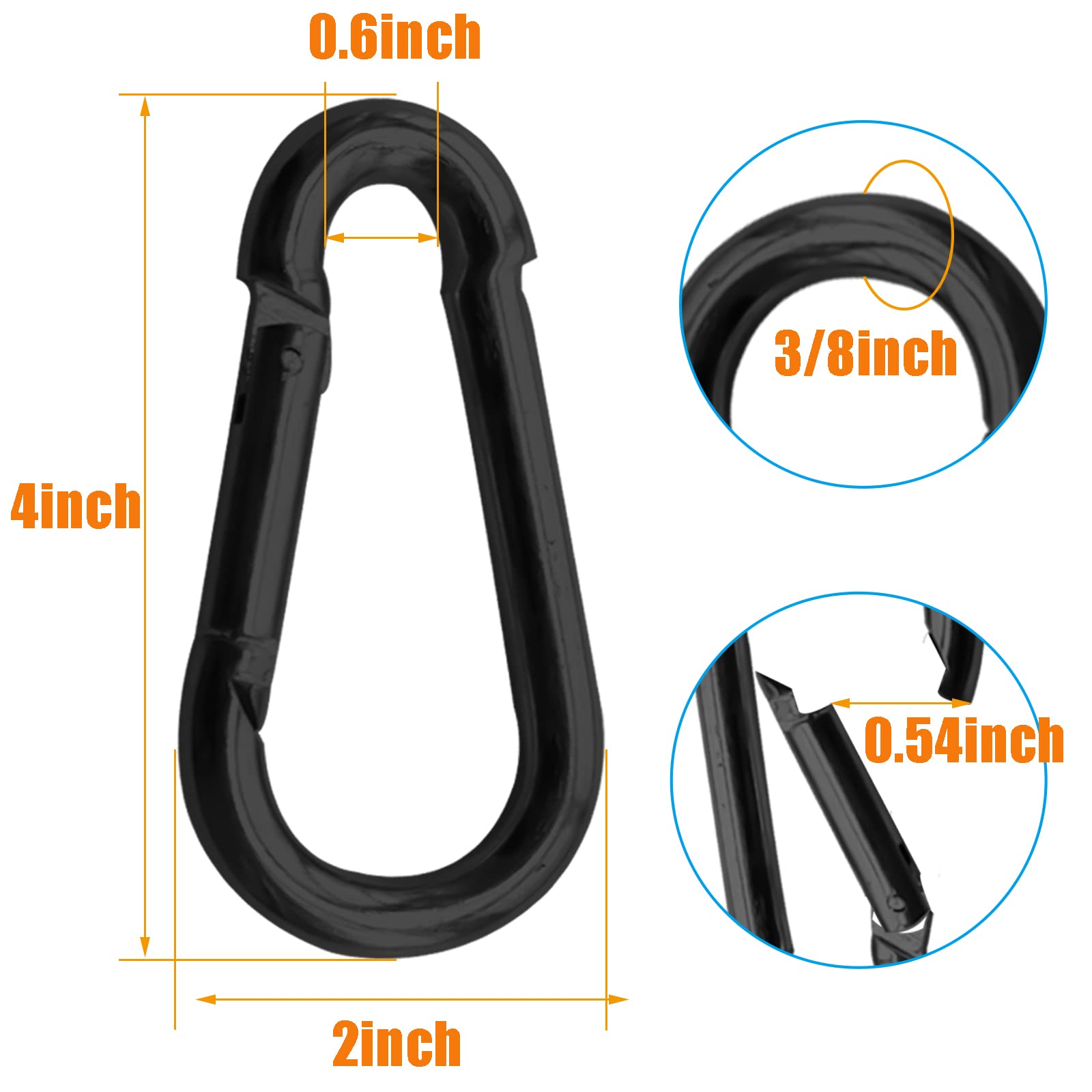- Durable and Strong Galvanized Spring Snap Hook: Each spring clip is made of high quality3/8” steel, designed for heavy duty uses; Galvanized carabiners are look pretty good with the black finish and shines in any environment; Black carabiner clips are hard material, waterproof and rustproof, long service life; Snap hooks also can be used as keychain clip, backpack carabiner, and camping hooks