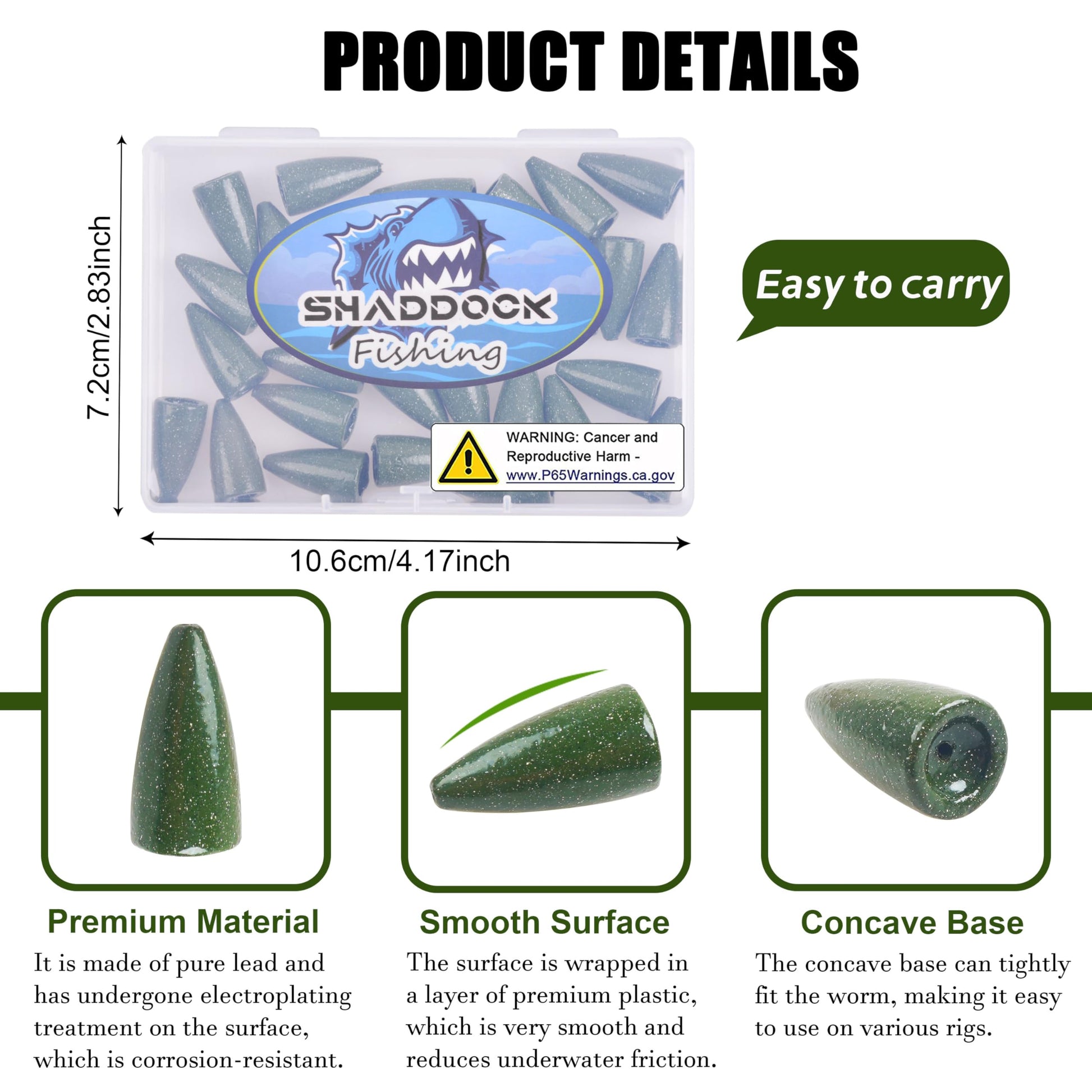 - Streamlined Design: The shape of the fishing worm sinker weight is like a bullet, with a circular narrow end at the front to avoid being hooked, and a concave base at the back that can closely fits the "head" of the plastic bait, making it easy to use on various rigs. The overall streamlined design reduces the possibility of entanglement with stones or rocks and reduces the resistance to falling into the water.