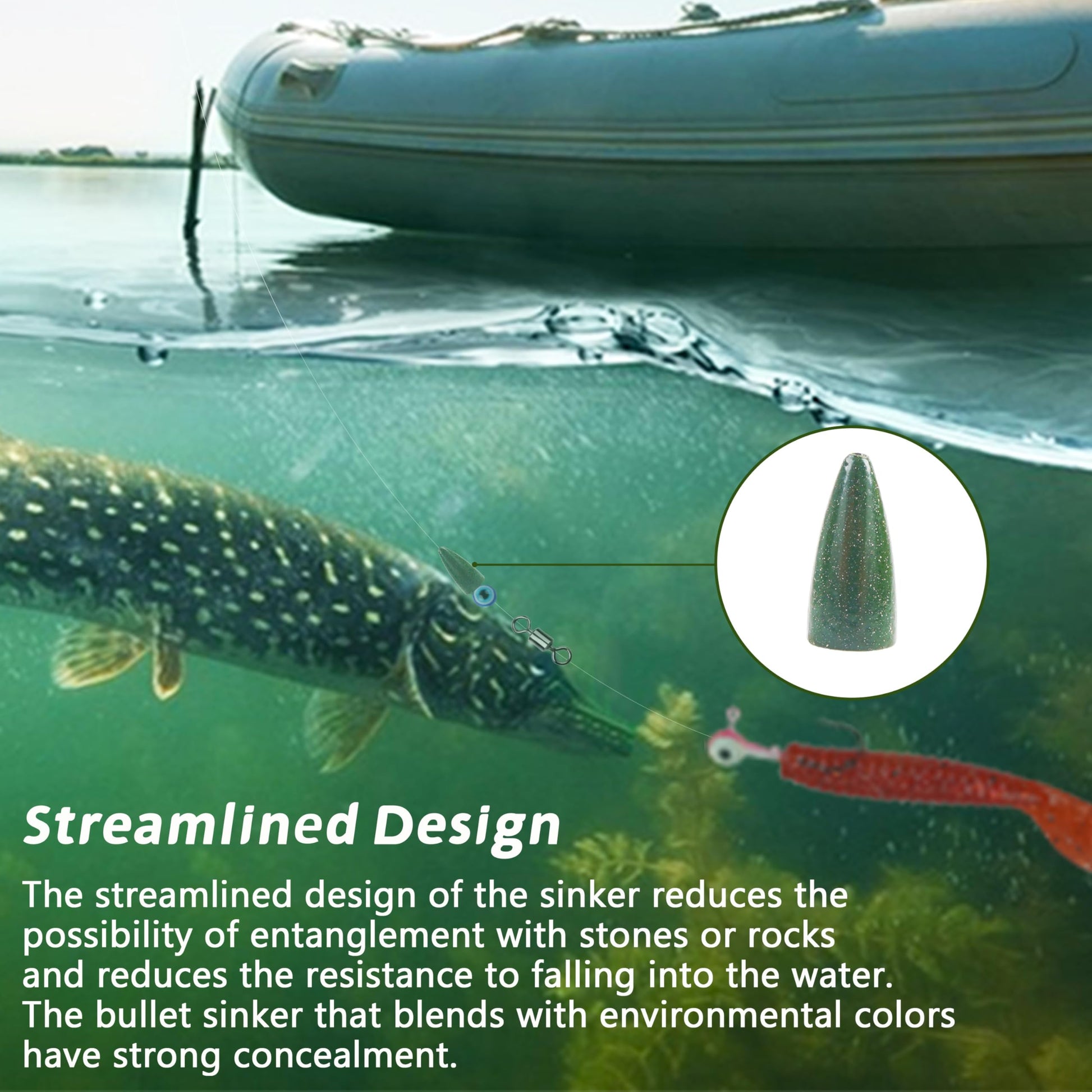 - High Quality Material: It is made of pure lead and has a surface treated with electroplating, which is sturdy and compact, easy to enter water, corrosion-resistant, abrasion-resistant, and can be used for a long time. The surface of bullet sinker is wrapped with a layer of green premium plastic material, which is very smooth and can reduce underwater friction, thereby minimizing the impact on lure swimming.