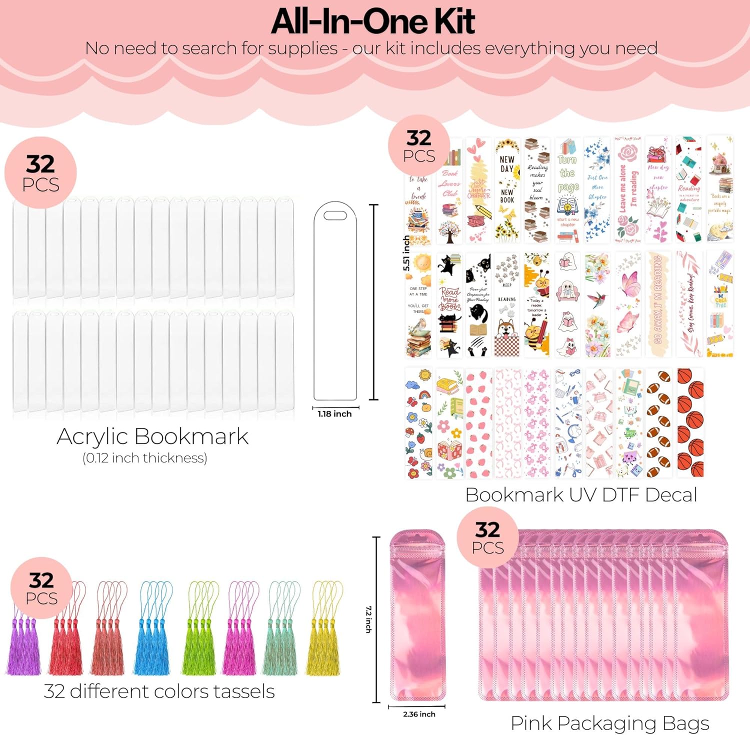 - 【128PCS DIY Bookmark Making Kit】:You will receive 32 blank bookmarks, 32 tassels, 32 UV stickers with different themes, and 32 packing bags to create your own unique bookmarks