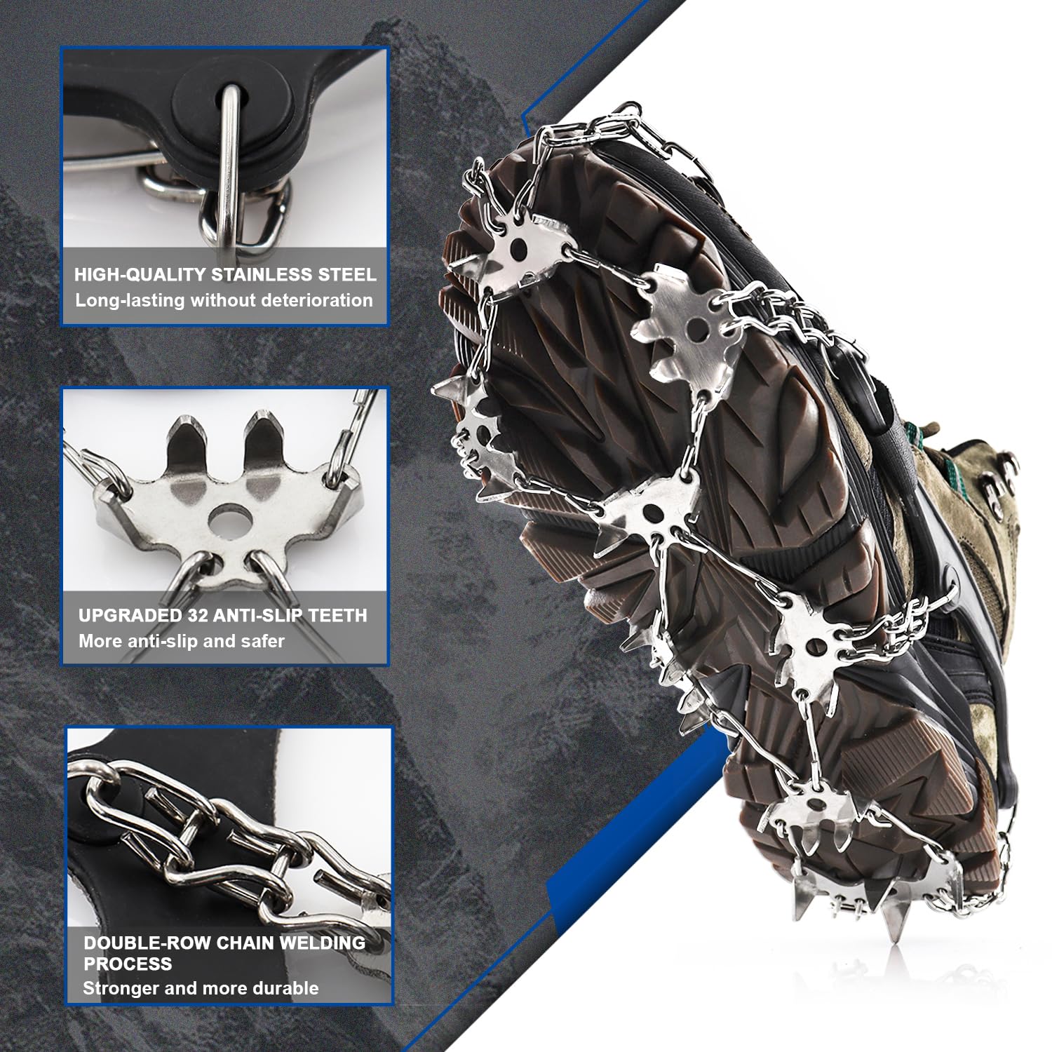 - 【Upgraded 32 stainless steel spikes】Our ice crampons are made of thicker stainless steel (1.8 mm), which is stronger and safer, and the double-layer chain connection with welding technology will not be broken, so you can rest assured that you are comfortable in hiking on the muddy road.