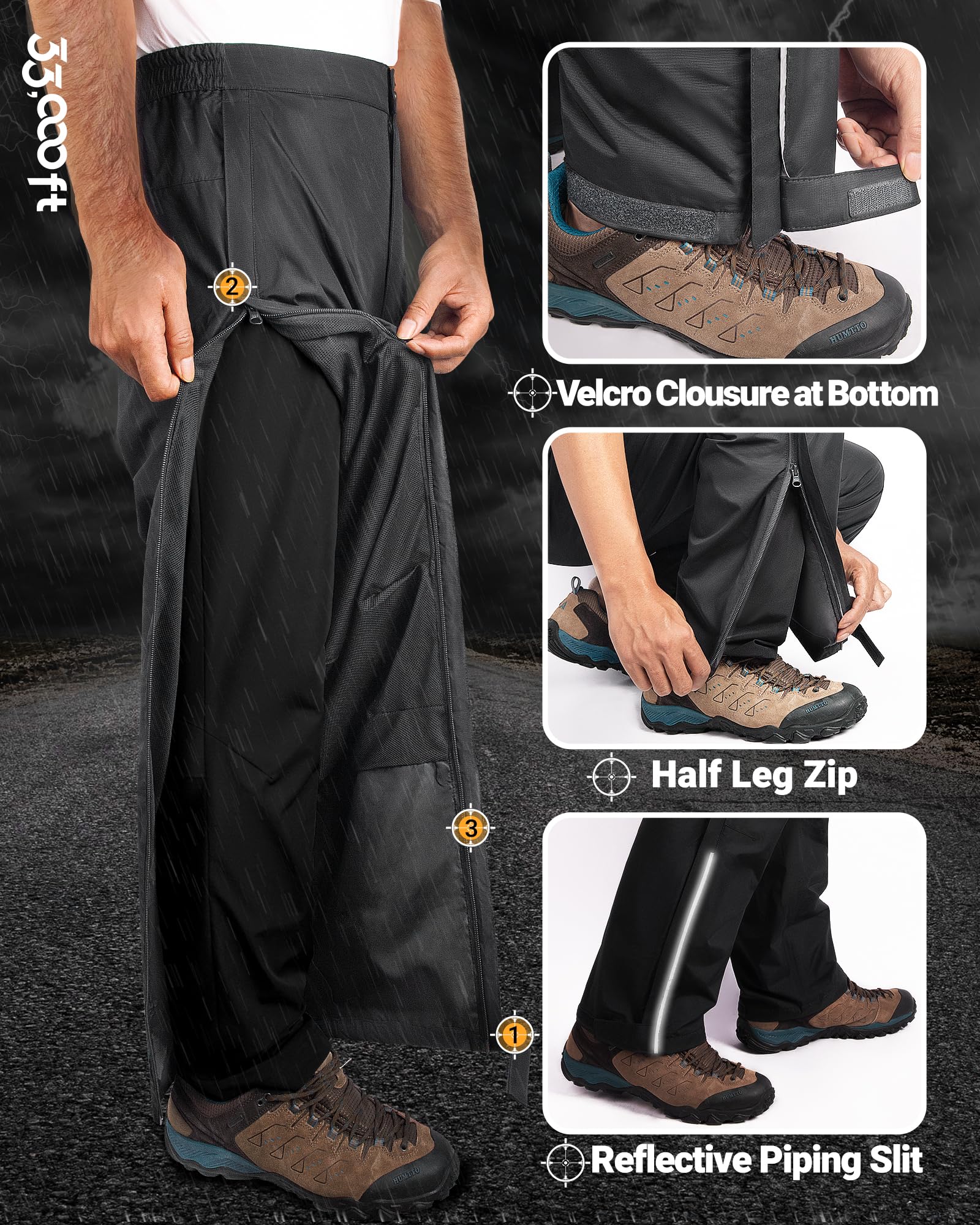 - Safe Design: 33,000ft breathable rain pants for men have reflective strips on the legs.The reflective piping slit keeps you high visibility during outdoor activities!The Velcro closure at bottom leg allows adjust the width for different fits and occasions.