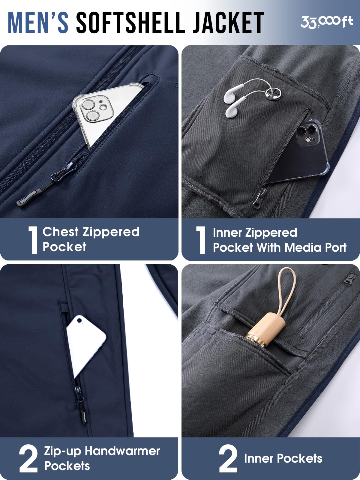- WINDBREAKER: 33,000ft mens waterproof fleece jackets feature a windproof mid-layer and a fleece lining. This mens fleece Lined softshell jacket with the adjustable drawstring hood, cuffs and drawstring hem. Men's midweight jacket with hood can keep windproof and warm in winter.