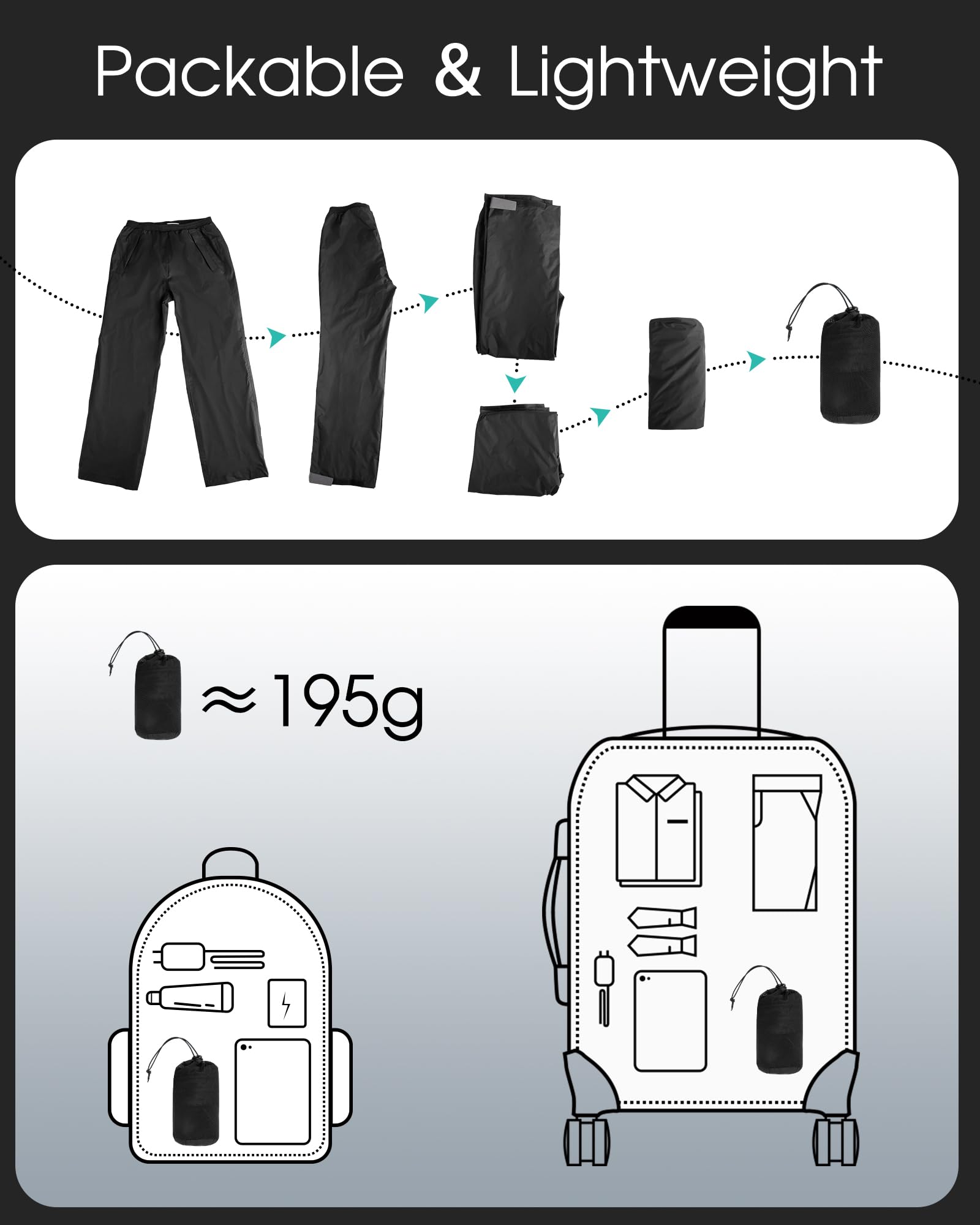 - Portability:33,000ft packable rain pants are lightweight,weighing only 195g.It also comes with a storage bag for easy storage of rain pants.It is very convenient to carry when traveling, and he hardly occupies a space in his backpack or suitcase.A good companion for your travels.