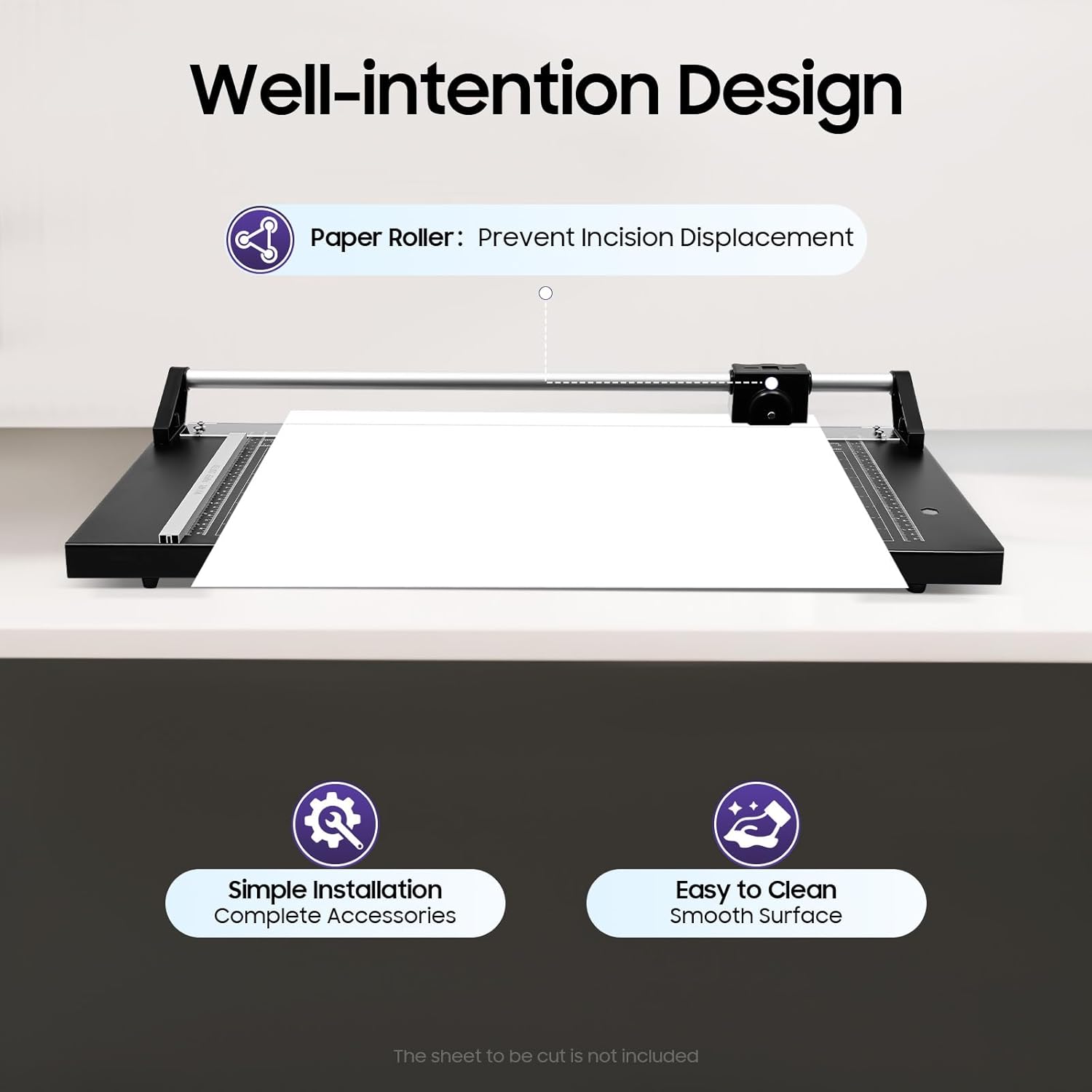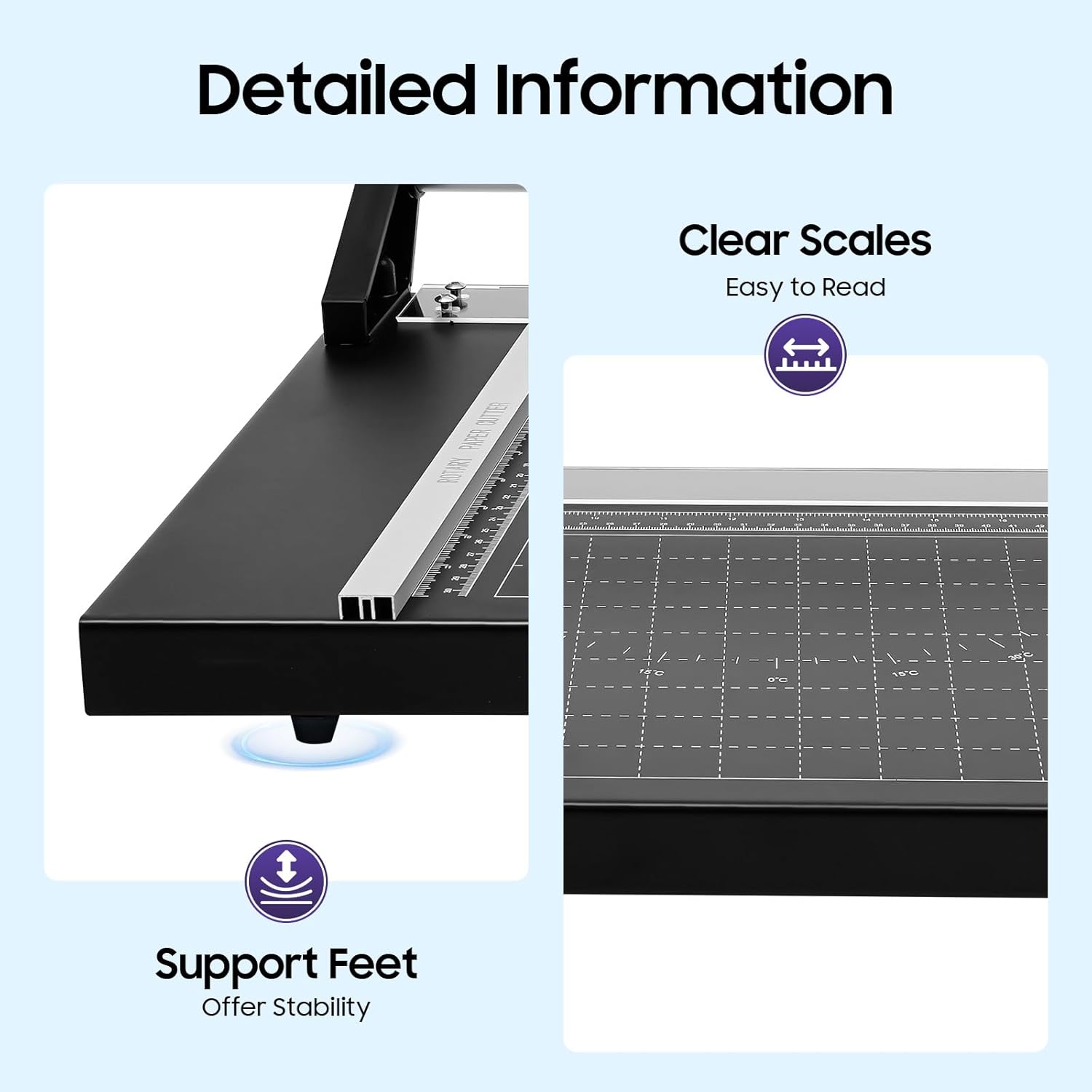 - Thoughtful Design: Roller cutter head and round blade allow for bi-directional paper cutting, which is very convenient and labor-saving. The aluminum alloy guide rail ensures smooth sliding of the cutter, improving cutting efficiency.