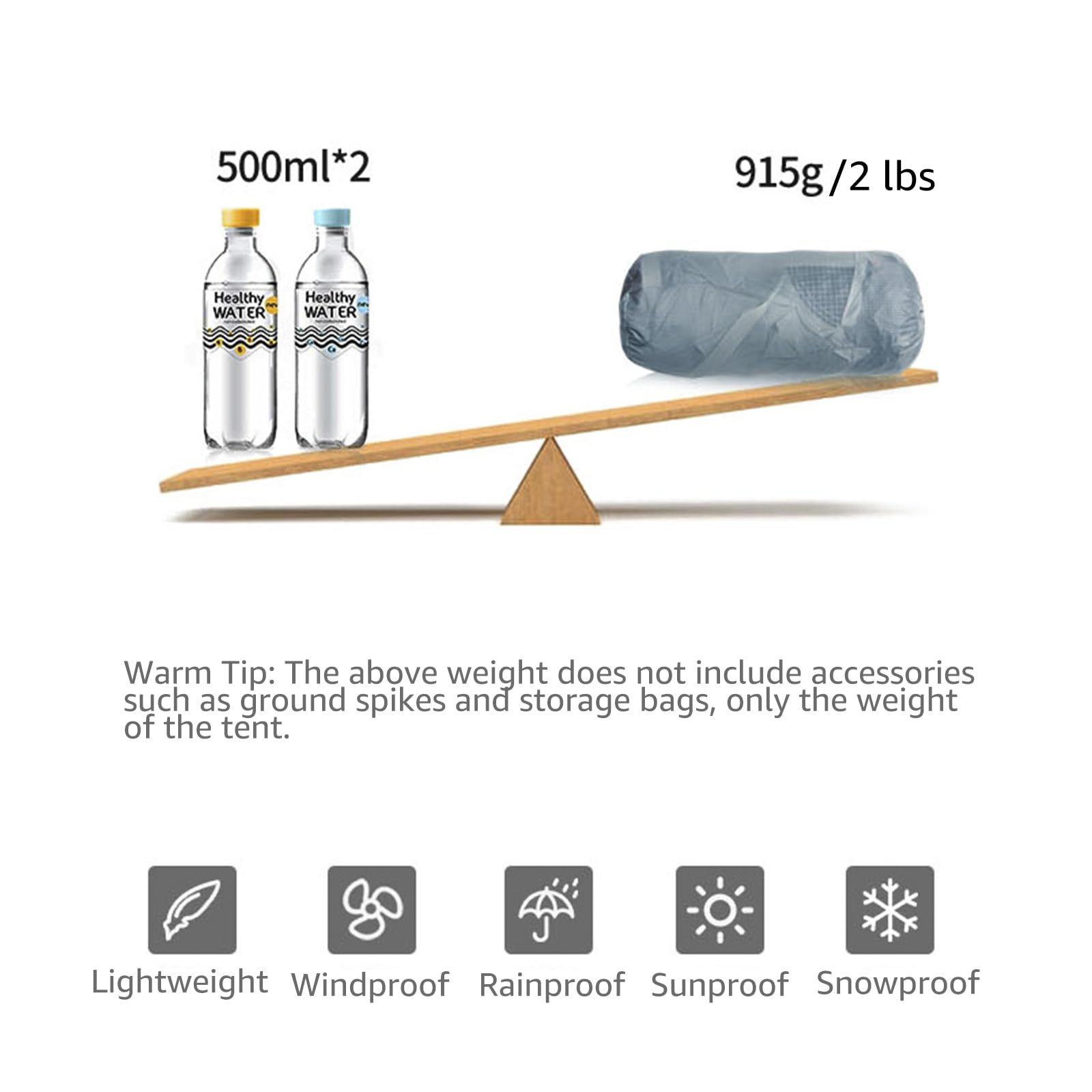 - Hiking Backpacking Tent: Perfect for mountaineering, hiking, camping and other outdoor sports. The difference between three-season and four-season is the material of the inner account: three-season uses 15D mesh, which has very good breathability. The 15D windproof and breathable cloth is used in all seasons, which can effectively resist cold air. You can choose according to the environment you often use. All use T-shaped door openings.