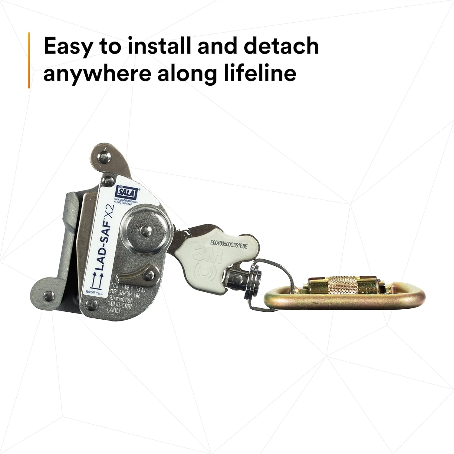 3M DBI-SALA Lad-Saf X2 Detachable Cable Sleeve/Traveler attaches the user to the lifeline and follows as they ascend or descend - it features a dual independent locking system that allows constant attachment to a harness while simultaneously gliding along the lifeline. 3M DBI-SALA Lad-Saf X2 Detachable Cable Sleeve/Traveler is compatible with a wide range of applications to meet the job requirements. 3M DBI-SALA Lad-Saf X2 Detachable Cable Sleeve/Traveler attaches anywhere on a vertical lifeline to help keep workers secured during a climb. It features a zinc-plated steel carabiner and two-independent locking systems to help ensure optimal security in the event of a fall. 3M DBI-SALA Lad-Saf X2 Detachable Cable Sleeve/Traveler is manufactured from stainless steel which helps to resist corrosion in harsh conditions. Designed for use on 9.5 mm. (3/8 in.) and 8 mm. (5/16 in.) vertical lifeline cables. The Lad Saf flexible cable system consists of a top and bottom bracket that act as anchors for a steel cable that runs the length of the climbing area. A Lad Saf X2 sleeve connects the worker to the system, automatically follows the user during the climb and locks onto the cable in the event of a fall, allowing the user to regain their footing. Designed for ease of use, economy and versatility, optional brackets/designs are available for bolting or welding the system, choose rung clamp sizes/styles, choose systems for straight or curved ladders and for connection to wood, concrete or steel structures. Hundreds of different brackets, styles and configurations are available to suit almost any application. In addition, the versatile system can be used by up to four workers simultaneously for added jobsite flexibility.