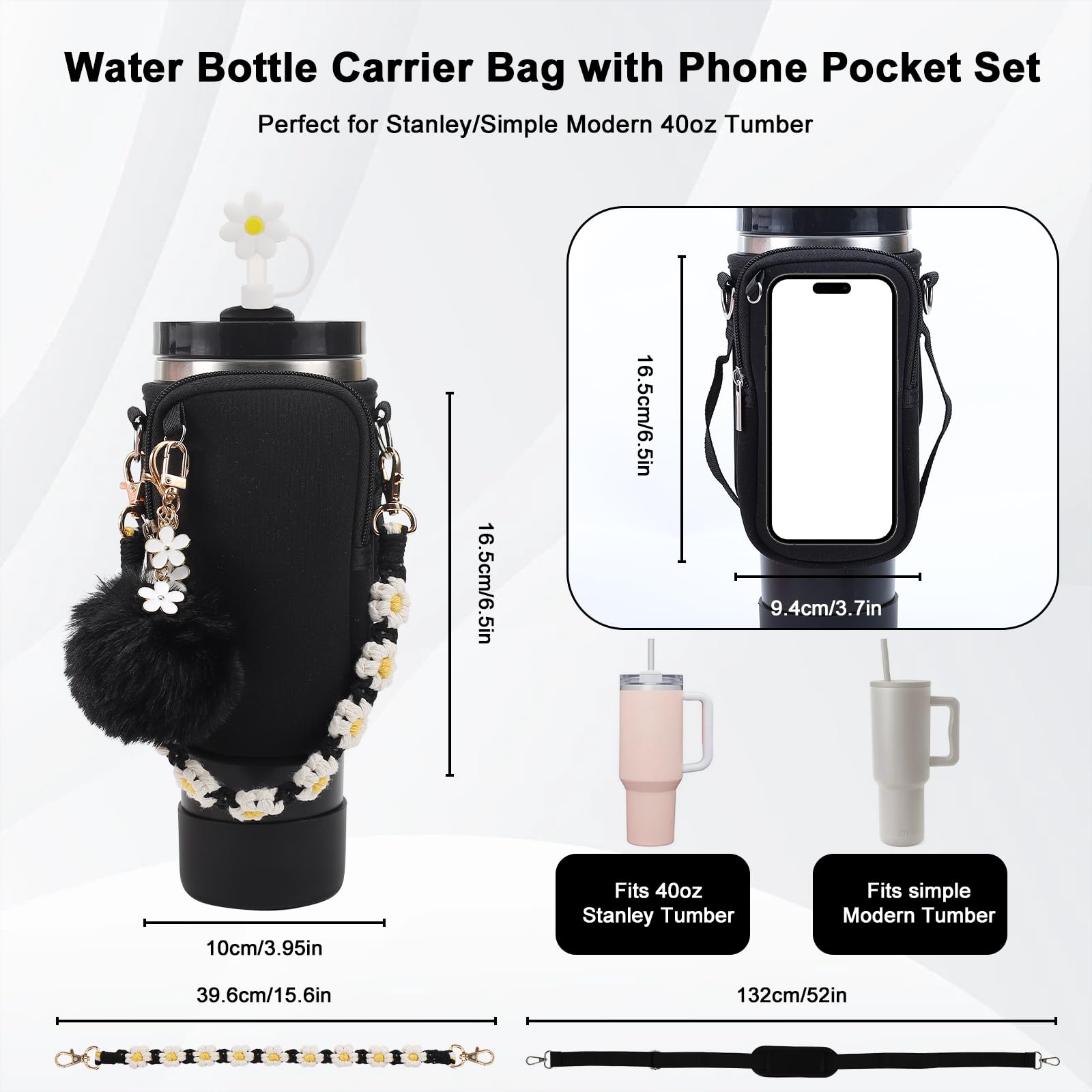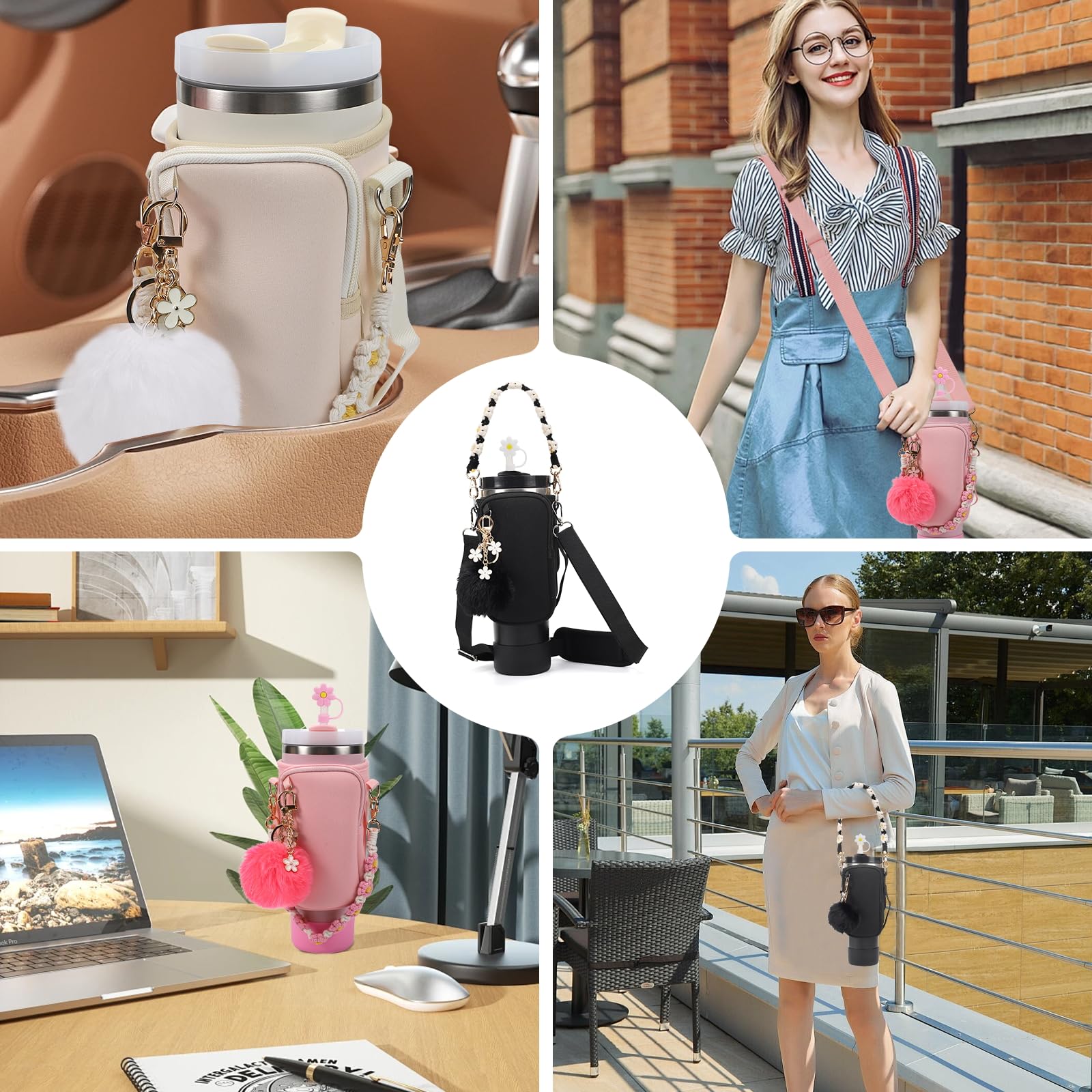 3tyto Stanley Cup Accessories Set Including Water Bottle Carrier Bag,Water Bottle Holder with Strap,Straw Cover, Charms,Silicone Boot for Stanley 40oz 30oz Tumbler (Black)