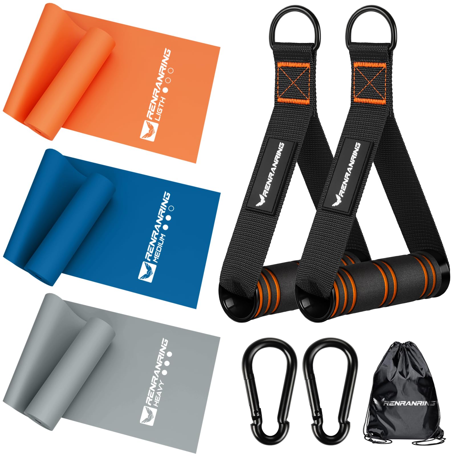 - Resistance Band Set of 9: Our package includes: 3 physical therapy bands, 2 soft handles, 2 black carbon steel buckle, 1 workout guide, 1 carry bag.