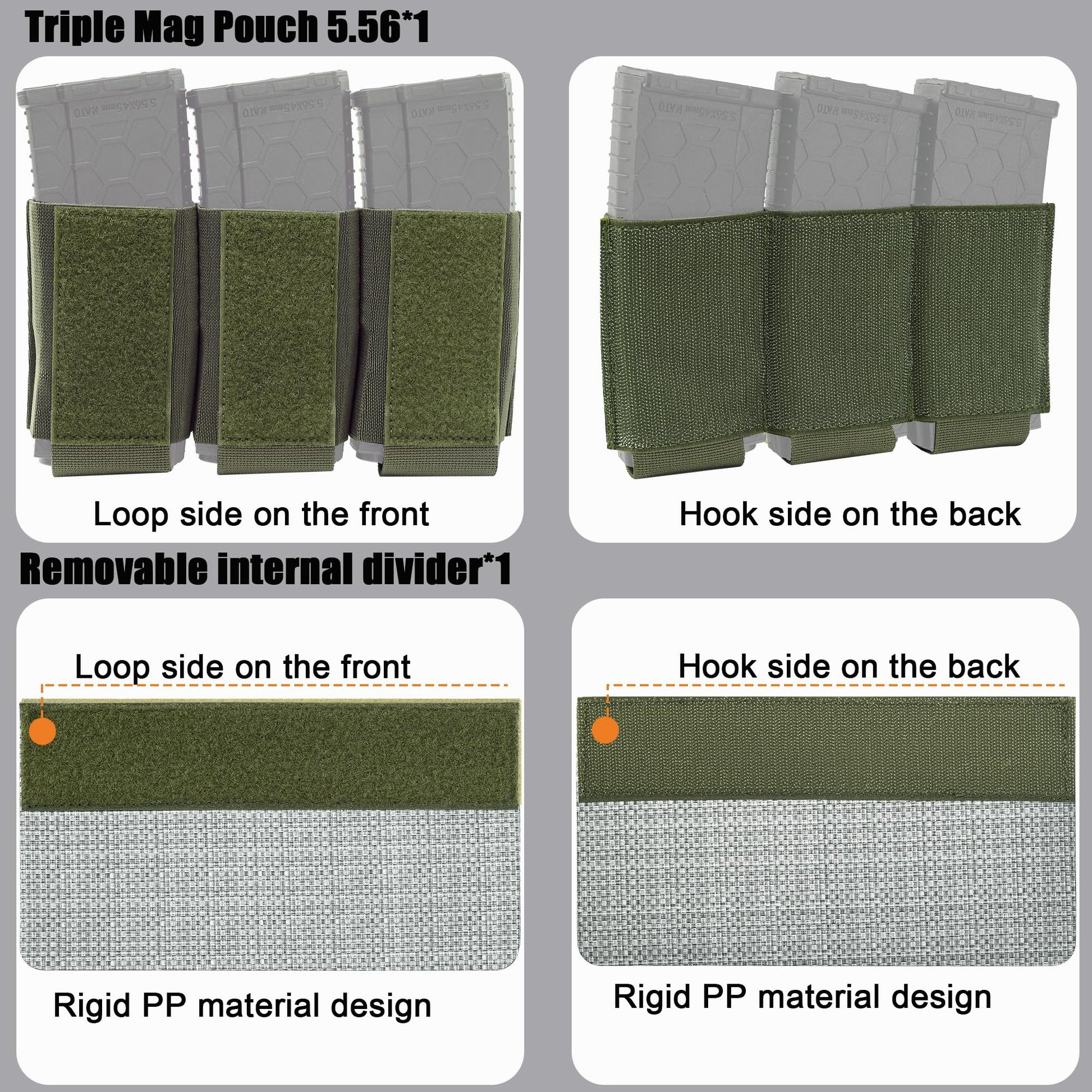 - The package includes 4 parts,Front Flap Pouch*1 ,Removable internal divider*1,Triple Mag Pouch 5.56*1,Kangaroo insert pouch*1