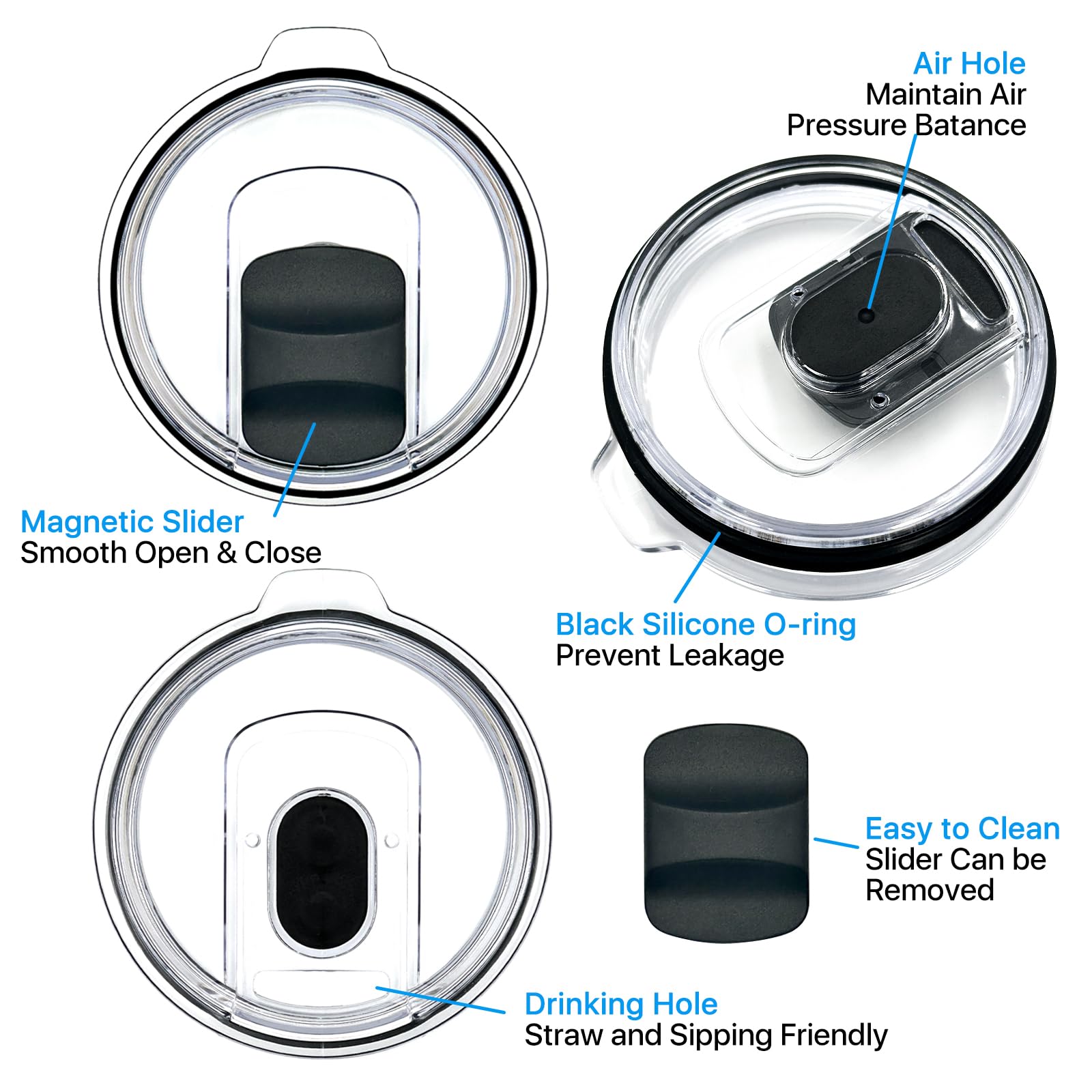 - 【Stronger Magnetic】Each spill proof tumbler replacement lid cover comes with 2 magnetic sliders replacement Don't worry about losing the slider and do not worry about spilling fluids when you are driving or traveling.The drinking hole is convenient for sipping directly or using a straw