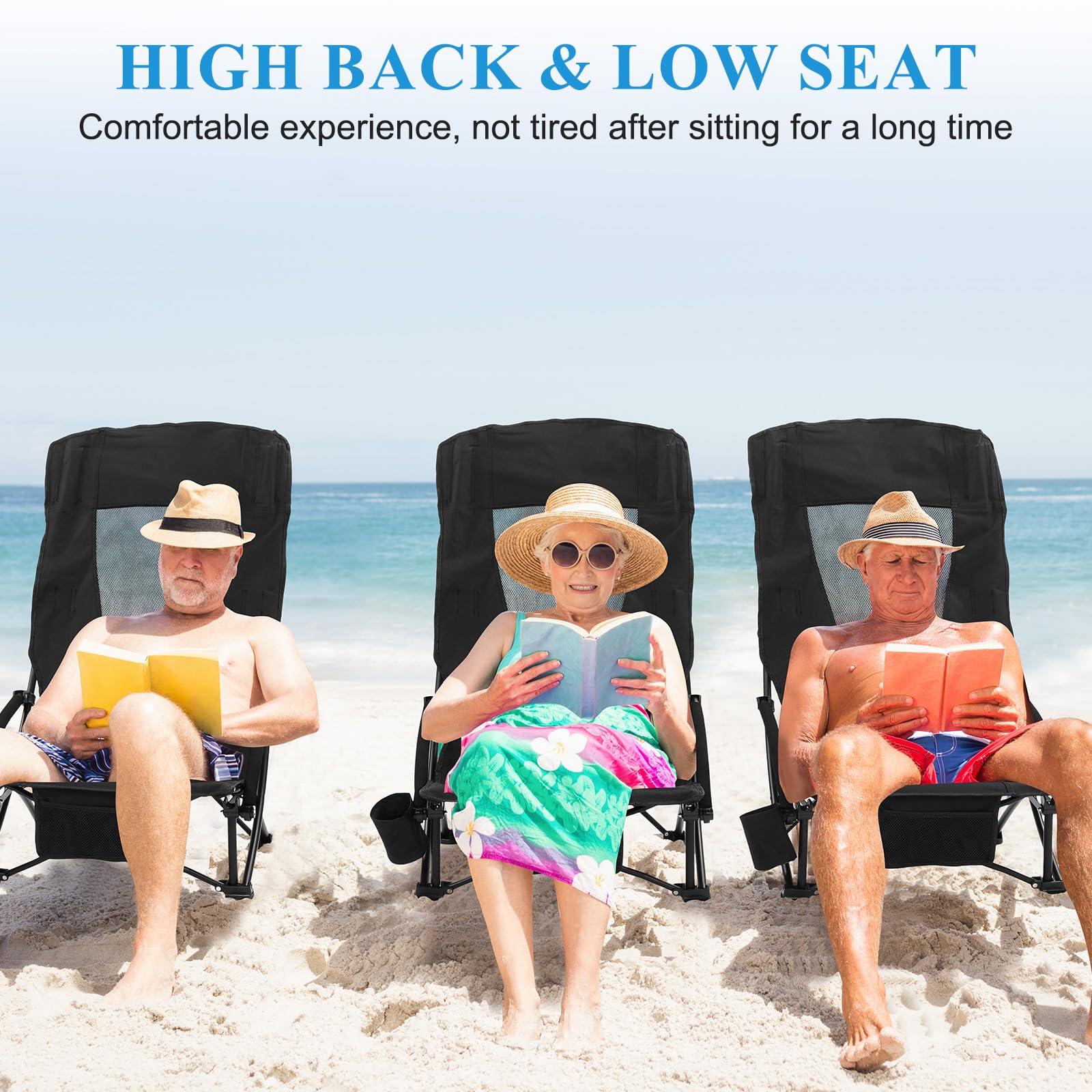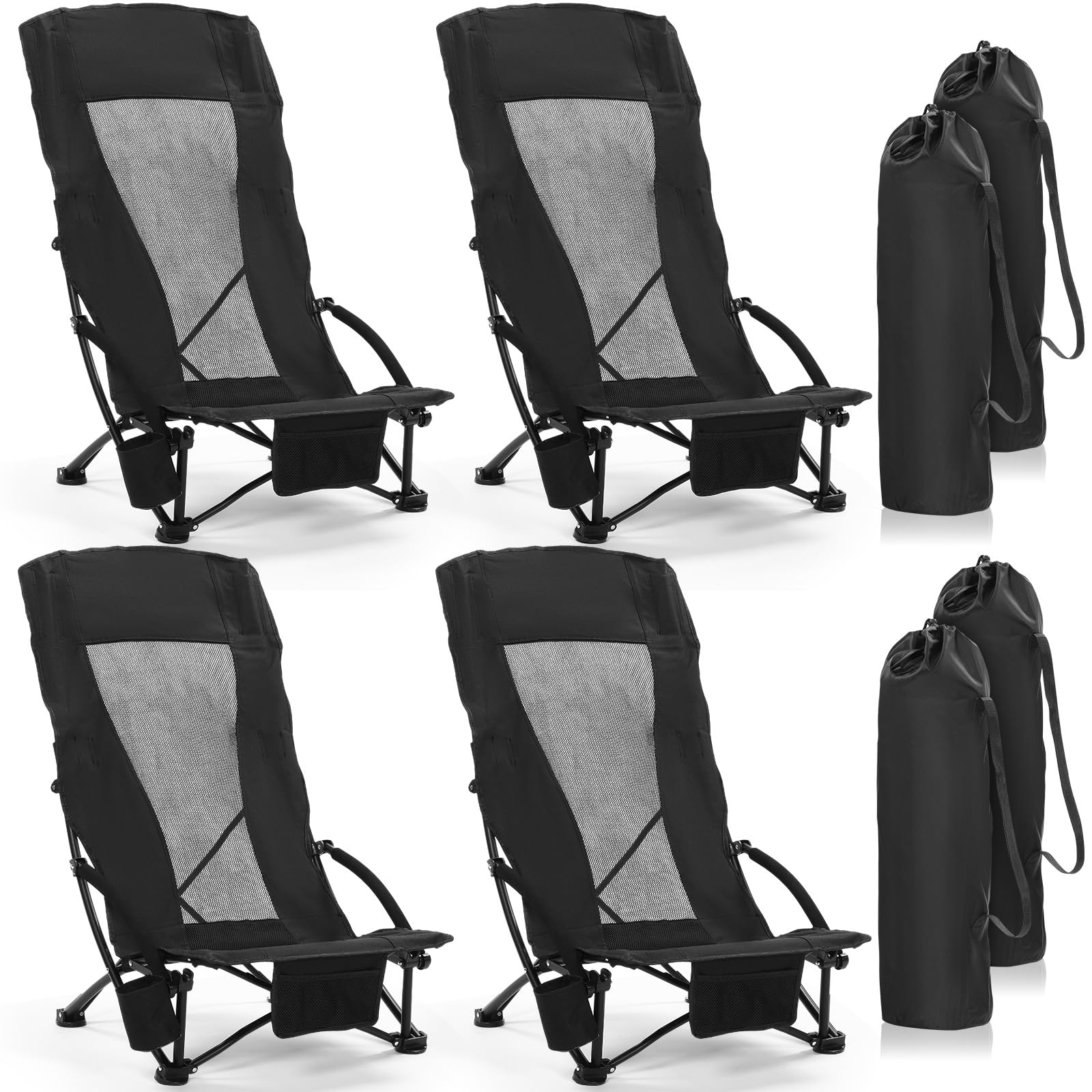 4 Pack Beach Chair for Adult High Back Low Beach Chair Bulk Portable Folding Camping Chairs Lightweight Sand Chairs with Cup Holder Carry Bag for Outdoor Camping Sand Concert