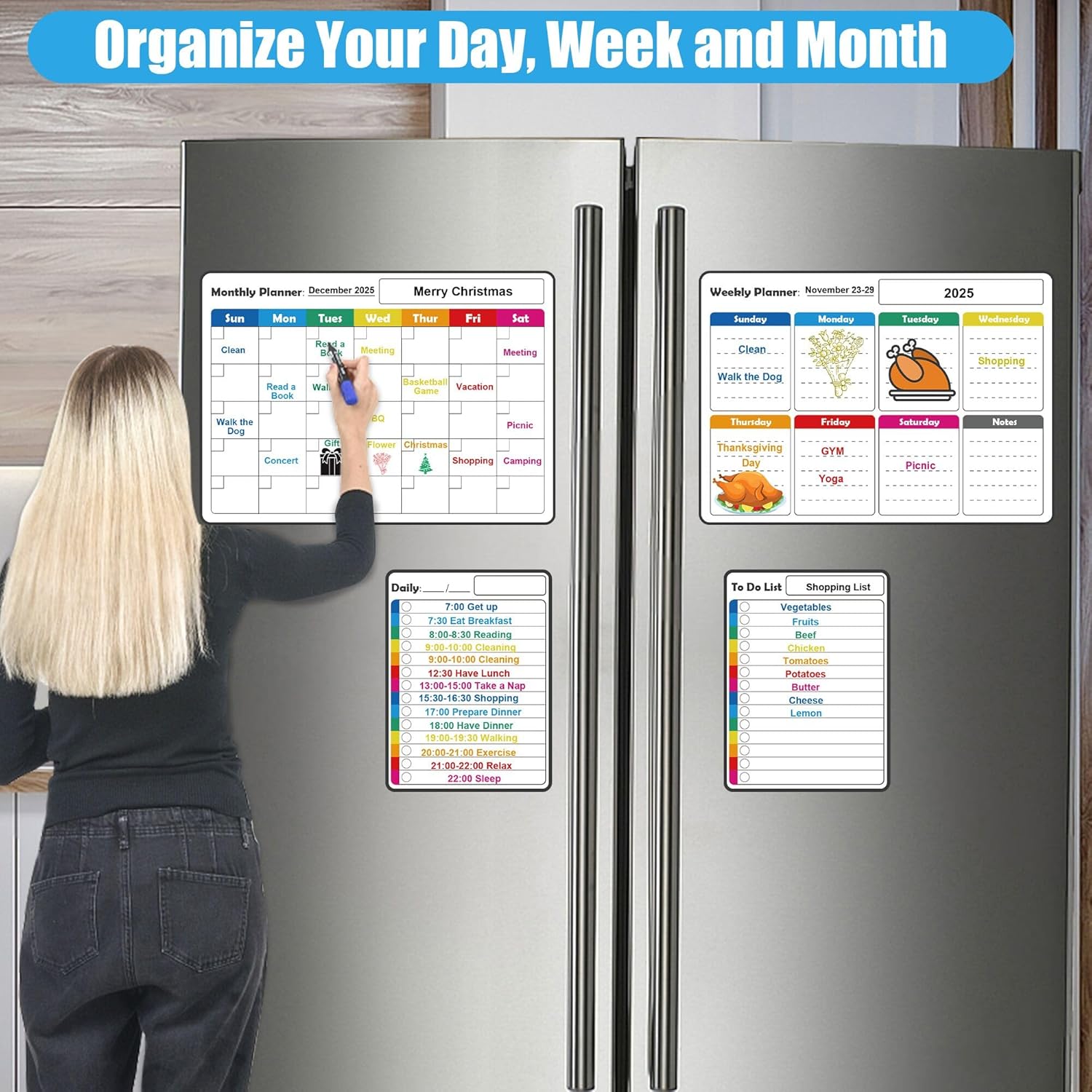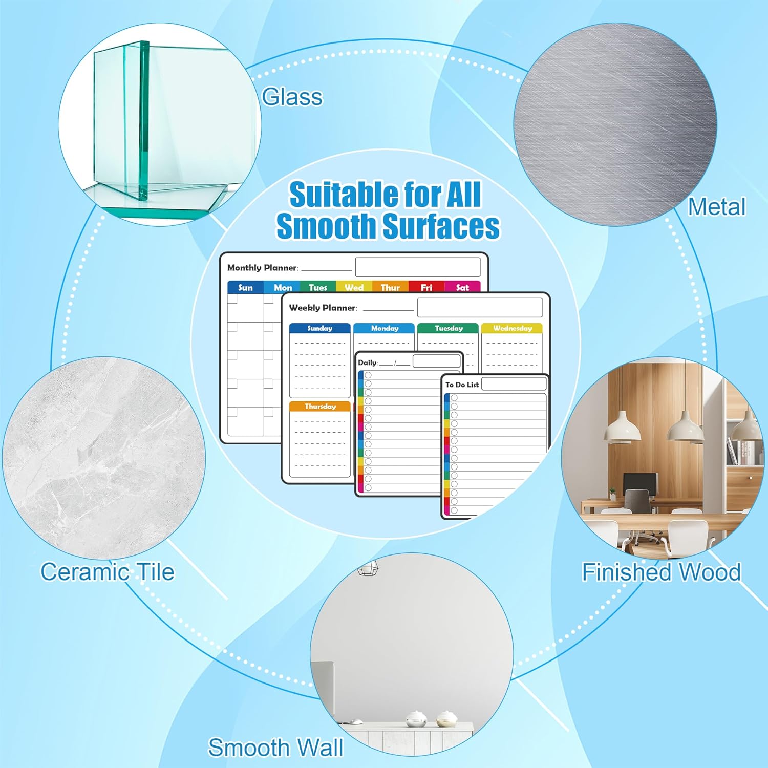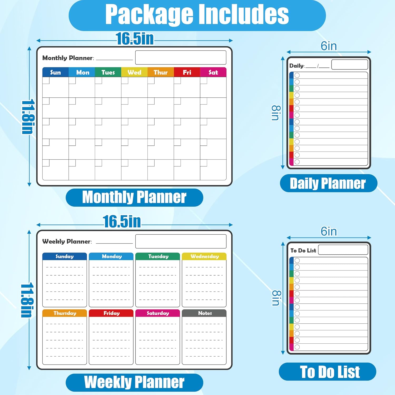 4 Pack Non-Magnetic Dry Erase Calendar Board Set, Anglecai Monthly, Weekly, Daily, List Calendar Sticks for Fridge, Wall, Door