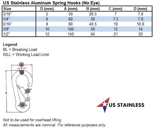 This is for four (4) quality aluminum spring hooks 1/4". This spring hook features a spring gate.The Metric equivalent is generally considered to be 6mm. This spring hook is lightweight and easy to carry. Suitable for applications where weight is an issue, ideal for key chains and backpacks. Made from aircraft grade 7075 aluminum. Not rated for overhead lifting.