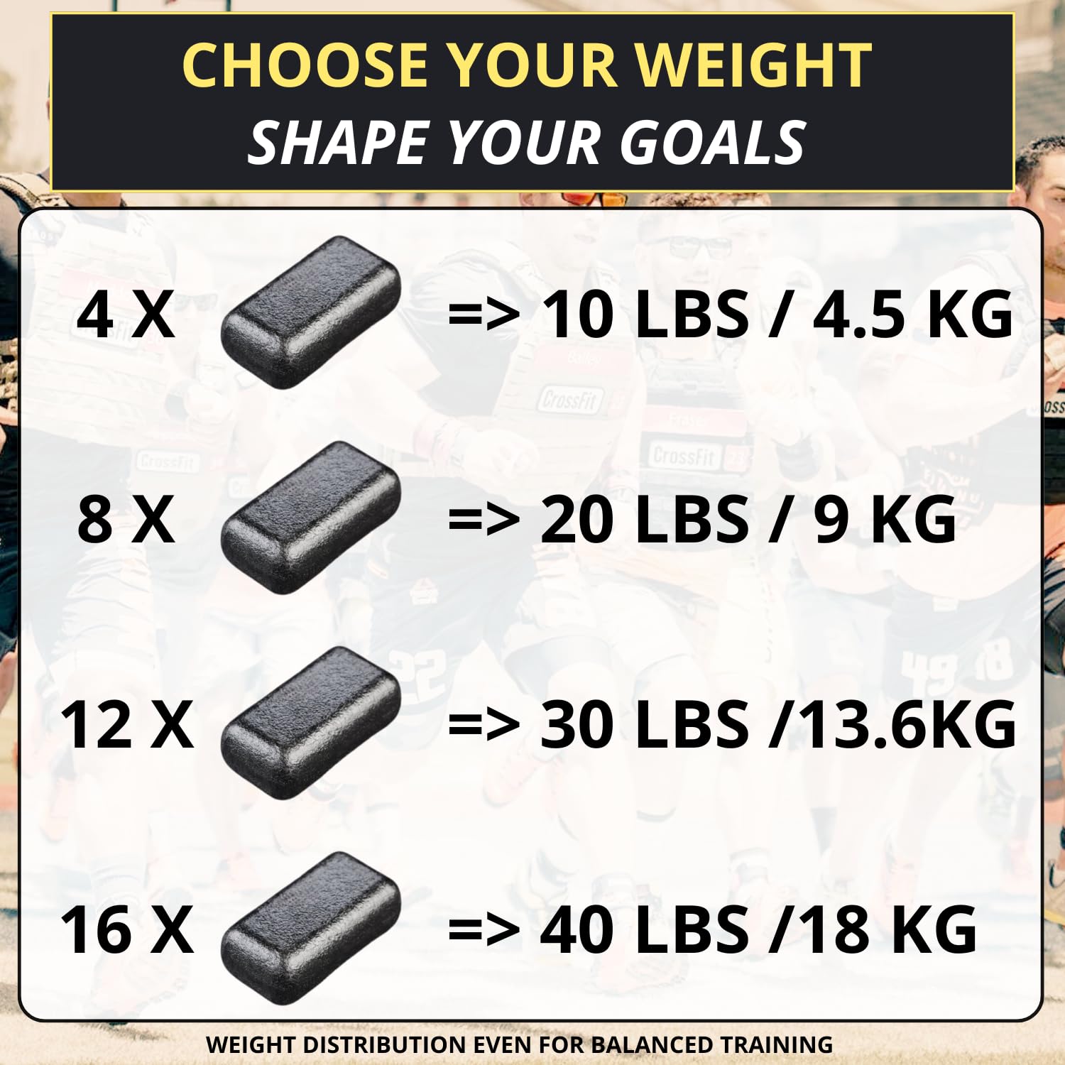 - šÆ MULTIFUNCTIONAL: weighted vest 40 pounds is now adopted by athletes in constant pursuit of improved results and self-improvement. This weighted workout vest for men boosts your endurance, muscle power and speed. Your body adapts more quickly to the intensity of the exercises. This weight vest 40 is now the secret of success for the best athletes in Murph challenge vest, Football, Hockey, Boxing, MMA, Rucking, weighted ruck, Gym weighted vest, Streetwork and Calisthenics. Train like you play!
