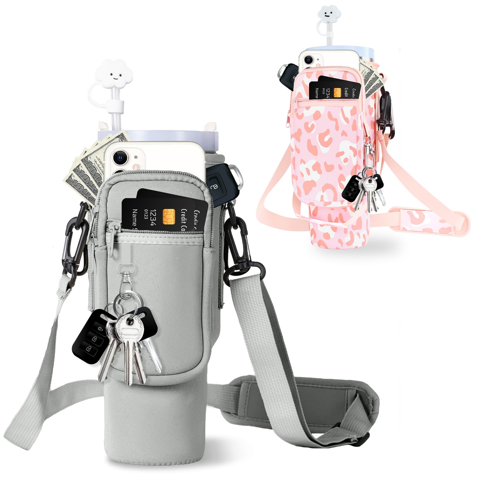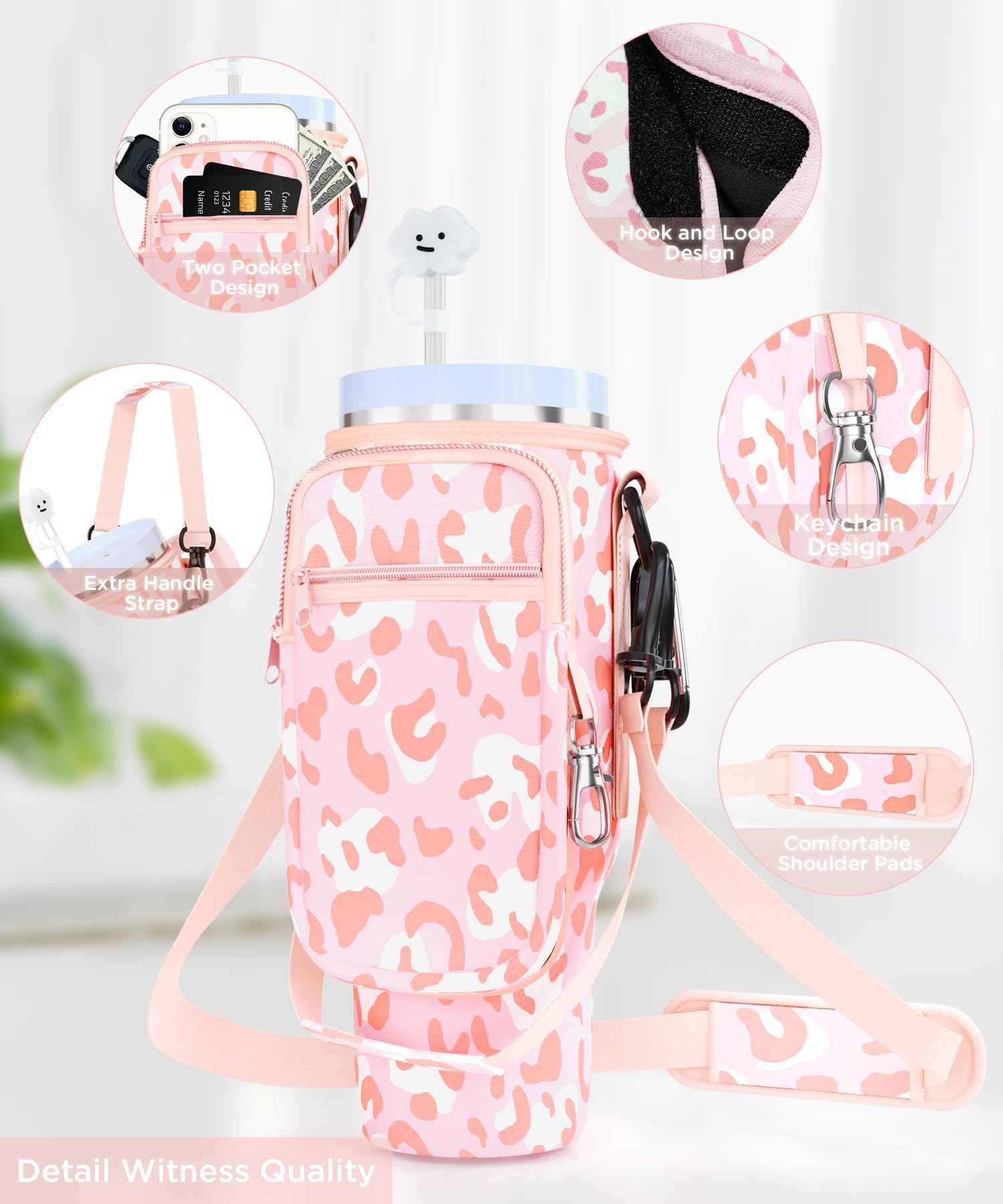 Details: 40OZ Water Bottle Carrier Bag with Phone Pocket Gray+Pink Leopard