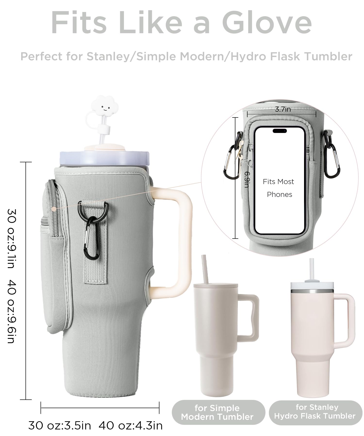 - š„¤ćAdjustable Shoulder Strap and Multiple PocketsćFor Stanley Quencher 40 oz Cup Sleeve comes with a removable and adjustable padded shoulder strap, the shoulder strap can be easily adjusted between 27.5" and 50" to fit a wide range of body shapes. The water bottle holder for stanley accessories 40 oz tumbler is designed with two front pocket designs that provide plenty of room for all your personal belongings such as smartphones, cash, cards,keys,etc.