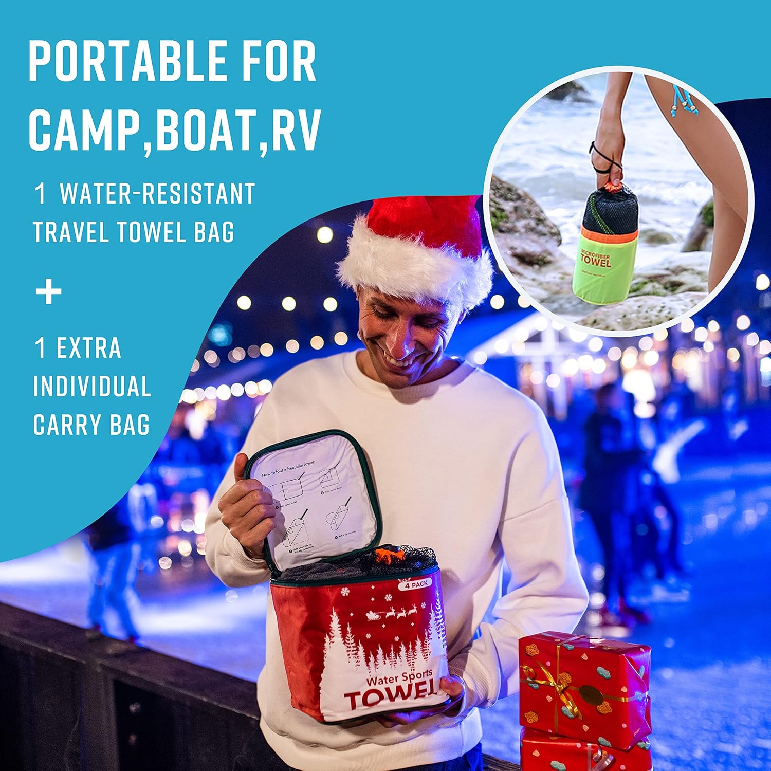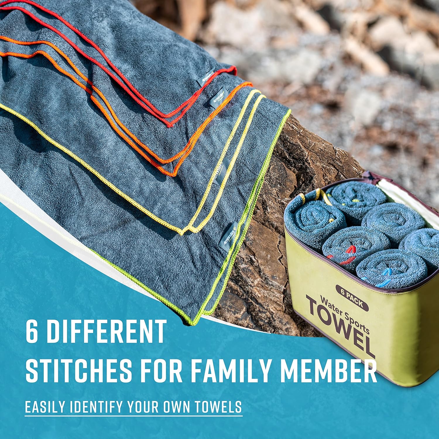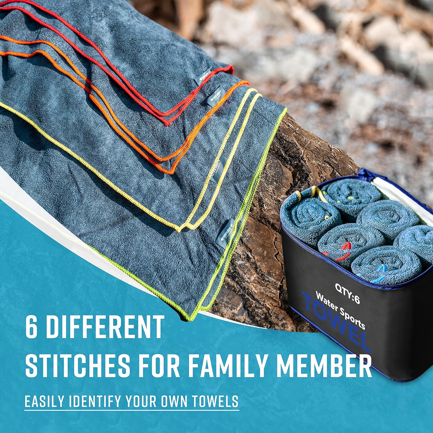 - 【Special Designed Family Pack】Awesome water resistant bag includes 4 towel and 1 extra mesh bag,a perfect choice for a family of four if you want to go camping or the beaches.Each towel has a special color seam that allows family members to track their own towels.