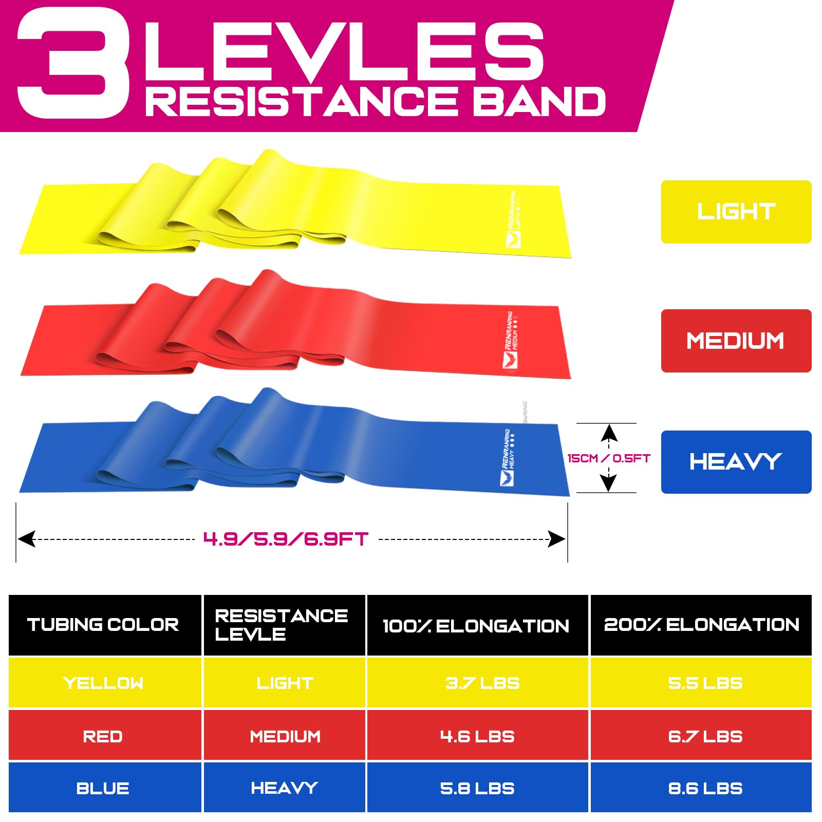 - 5.9FT Exercise Bands Levels: Come with 3 color, the different colors have an obviously different tension/strength. Yellow 3.7~5.5 lbs, Red 4.6~6.7 lbs, Blue 5.8~8.6 lbs. 4.9 ft long by 5.9 inches wide.
