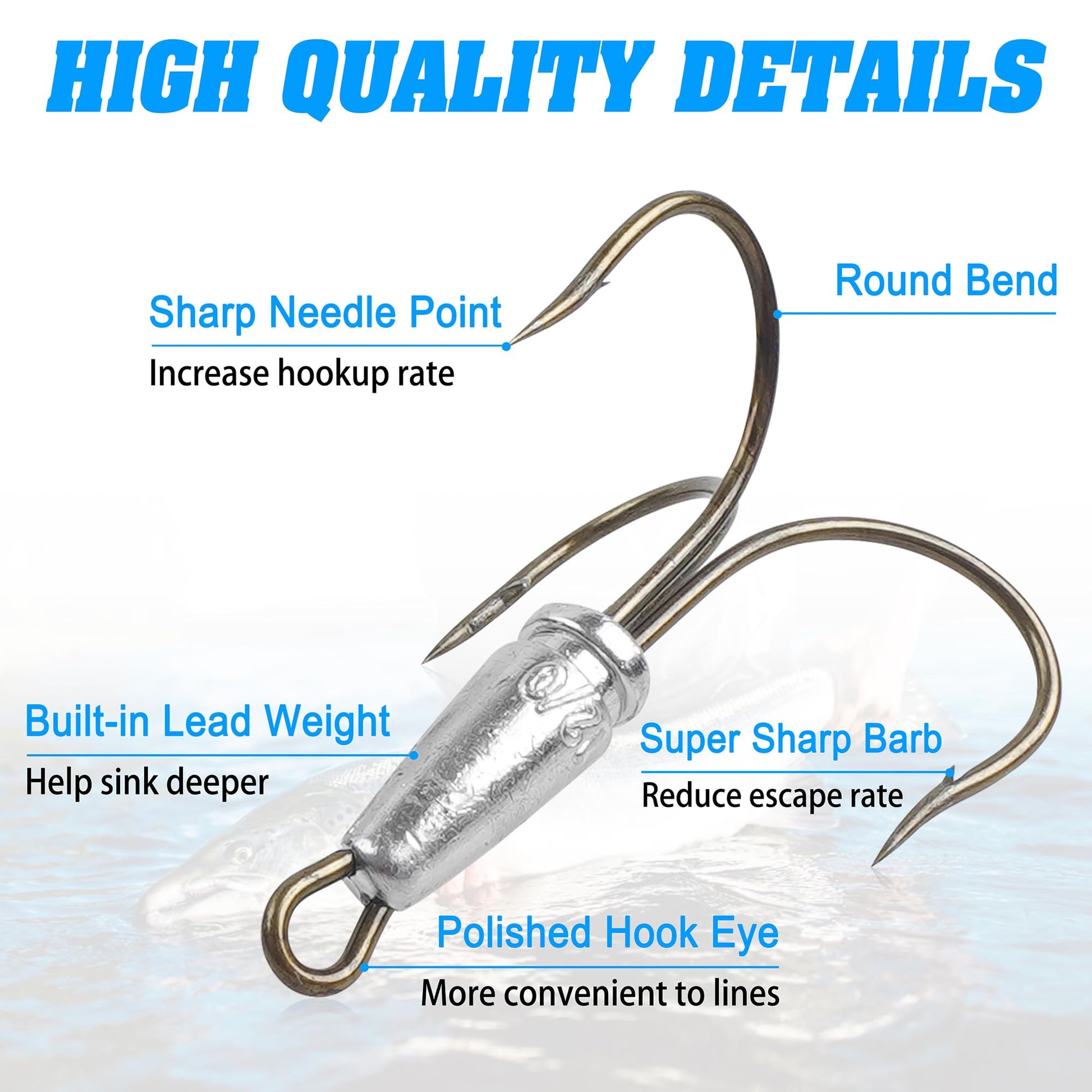 - 【SIZE&QUANTITY】5pcs snagging weighted treble hook in a box,4 sizes available 8/0(1.02oz), 10/0(1.41oz), 12/0(1.87oz),14/0(2.75oz). Multiple size can meet you different needs