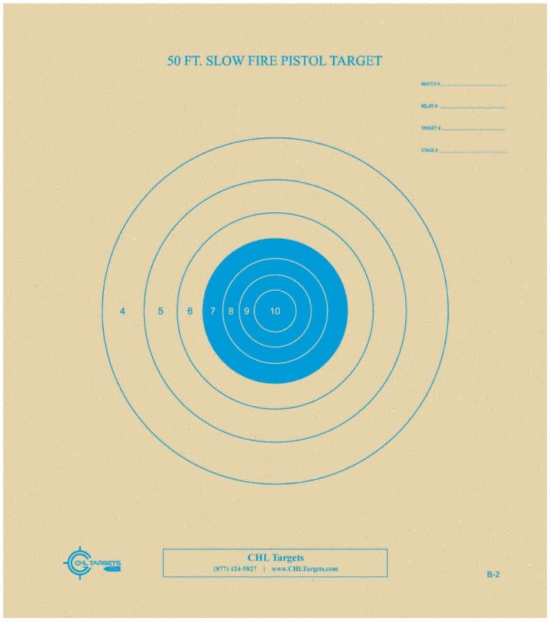The B-2 target is the Official NRA target used in NRA Sanctioned Pistol shooting competitions. The B-2 target is designed to be shot at a distance of 50 Feet.The B-2 target has 1 bullseye, with the bullseye 3 1/16" in diameter & black in color. Slow fire. The B-2 target is printed on heavy paper approved by the NRA. All targets sold by CHLTargets.com are Made In The USA. 10 ring .....................0.90 in 9 ring .......................1.54 in 8 ring .......................2.23 in 7 ring .......................3.07 in 6 ring .......................4.16 in 5 ring .......................5.56 in 4 ring .......................7.33 in