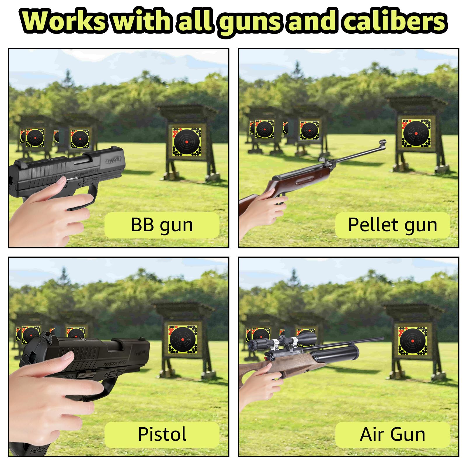 - Wide Application: These paper targets for shooting range are used with all firearms and calibers, including guns, pistols, rifles, airsoft guns, pellet guns, shotguns and more