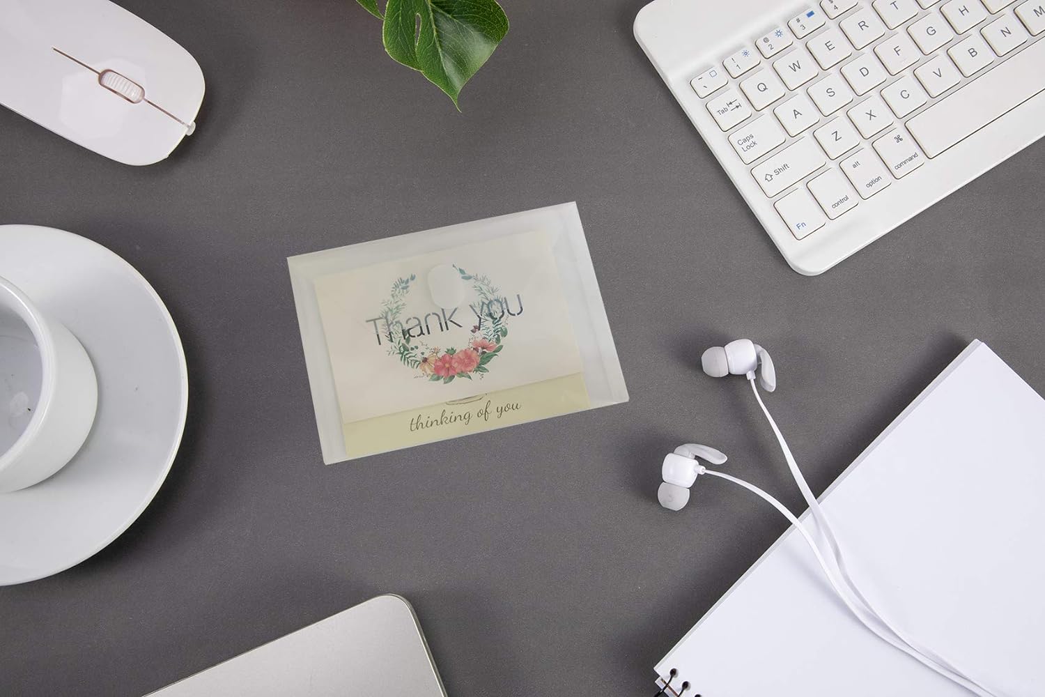 Transparent A7 envelopes are made of thick acid free Polypropylene material, waterproof, tear resistant and keeping clean, features clear, you can get the files you need at a glance.