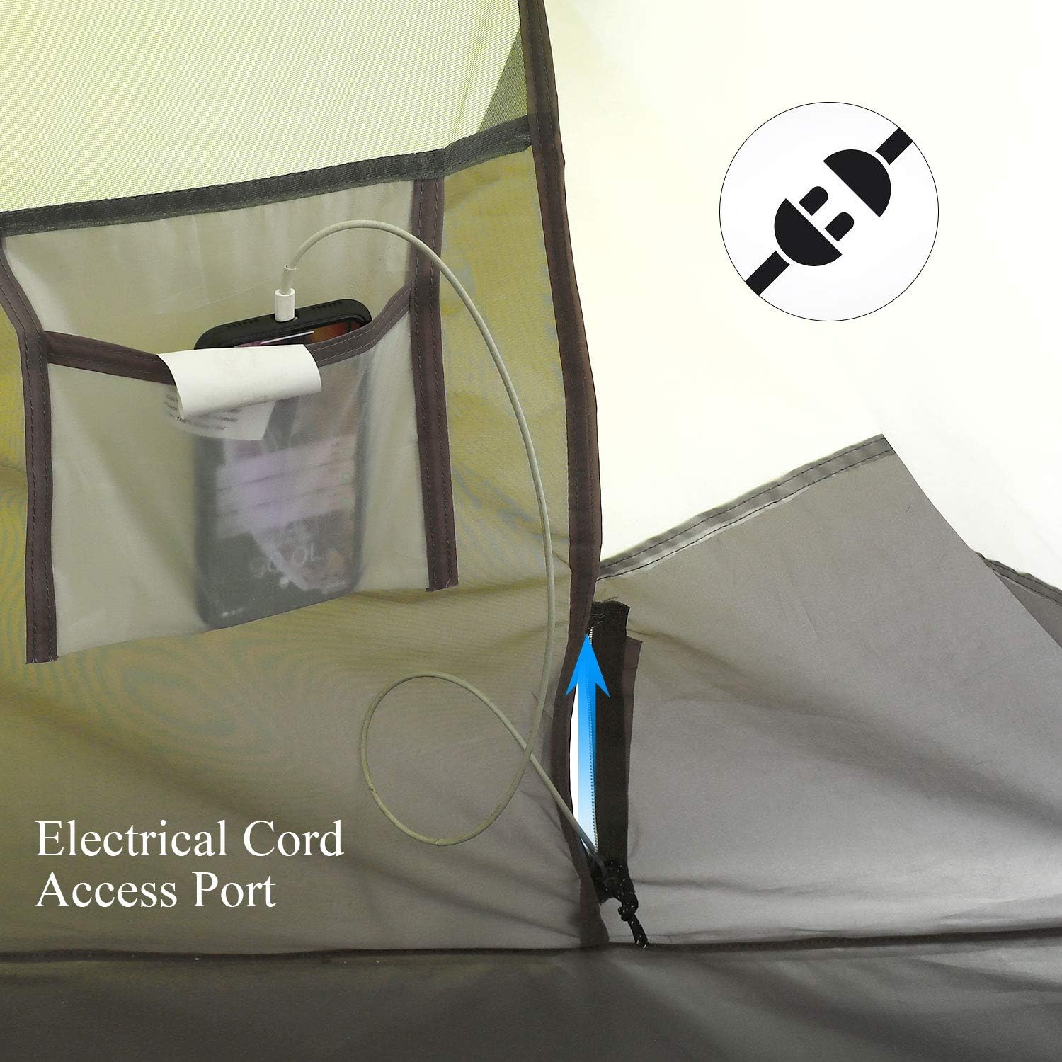 Through the E-port you can run a power cord from outside power source into the devices of your tent.
