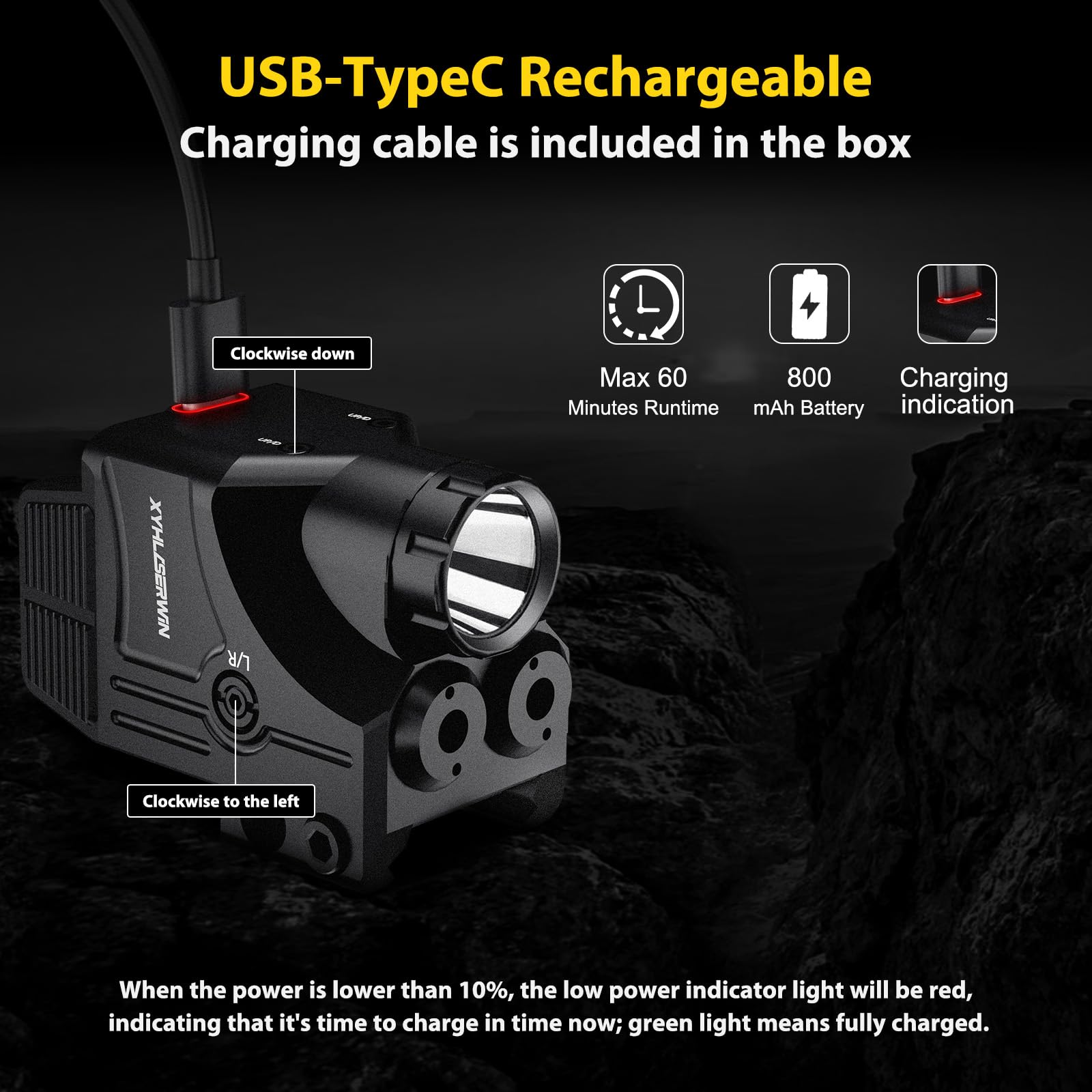 - High Brightness Flashlight: Equipped with a rechargeable built-in battery, the tactical laser light combo delivers a powerful 600 Lumens output for the flashlight. The battery life varies depending on usage: approximately 12 hours for laser only, 75 minutes for flashlight only, and 60 minutes for both flashlight and laser operation.