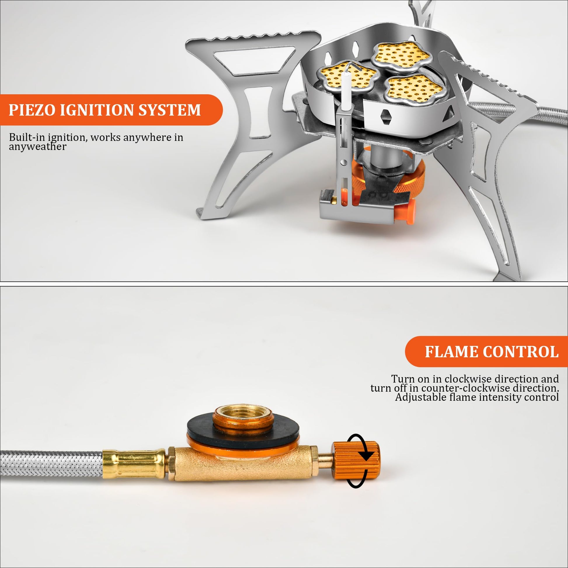 - 【Multi-Gas Compatibility】Compatible with isobutane, butane, and 1 lb. propane tanks, this stove offers unmatched versatility. The extended 50cm hose provides added safety and convenience compared to standard 30cm hoses.