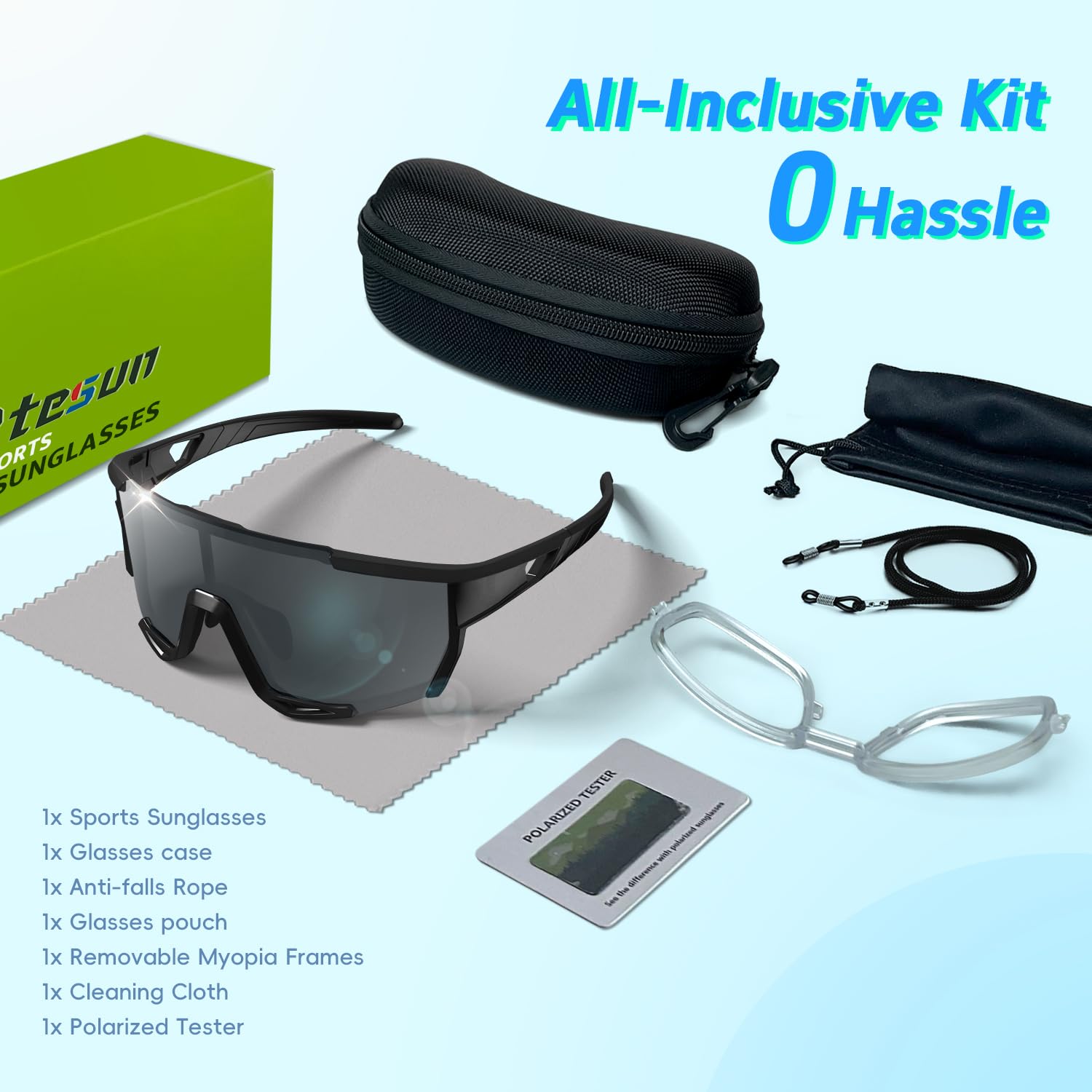 7 IN 1 Polarized Sports Sunglasses for Men Women, [UV400 Protection] [Removable Myopia Frame] Slim Fit Black Sunglasses for Running Baseball Driving Fishing Cycling