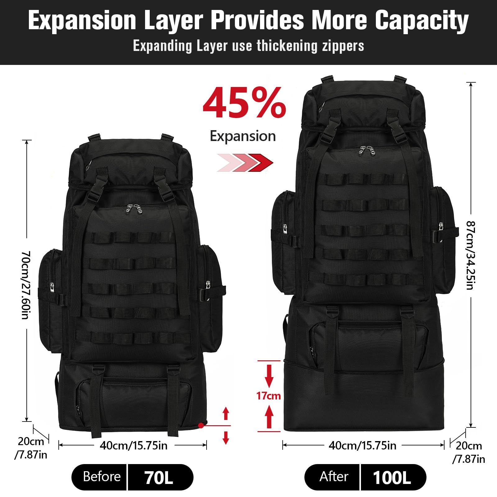 - 【Size & Lightweight】: The expanded size (100 liters) is 34.2*15.8*7.87inchs, ordinary dimension (70 liters) is 27.5*15.8*7.87inchs; This mountaineering backpack weighs only 3.3lb/1.5kg for easy carrying, and adding no burden to your travel. Perfect size for camping backpack, hiking backpack, trekking backpack, traveling, hunting, fishing.